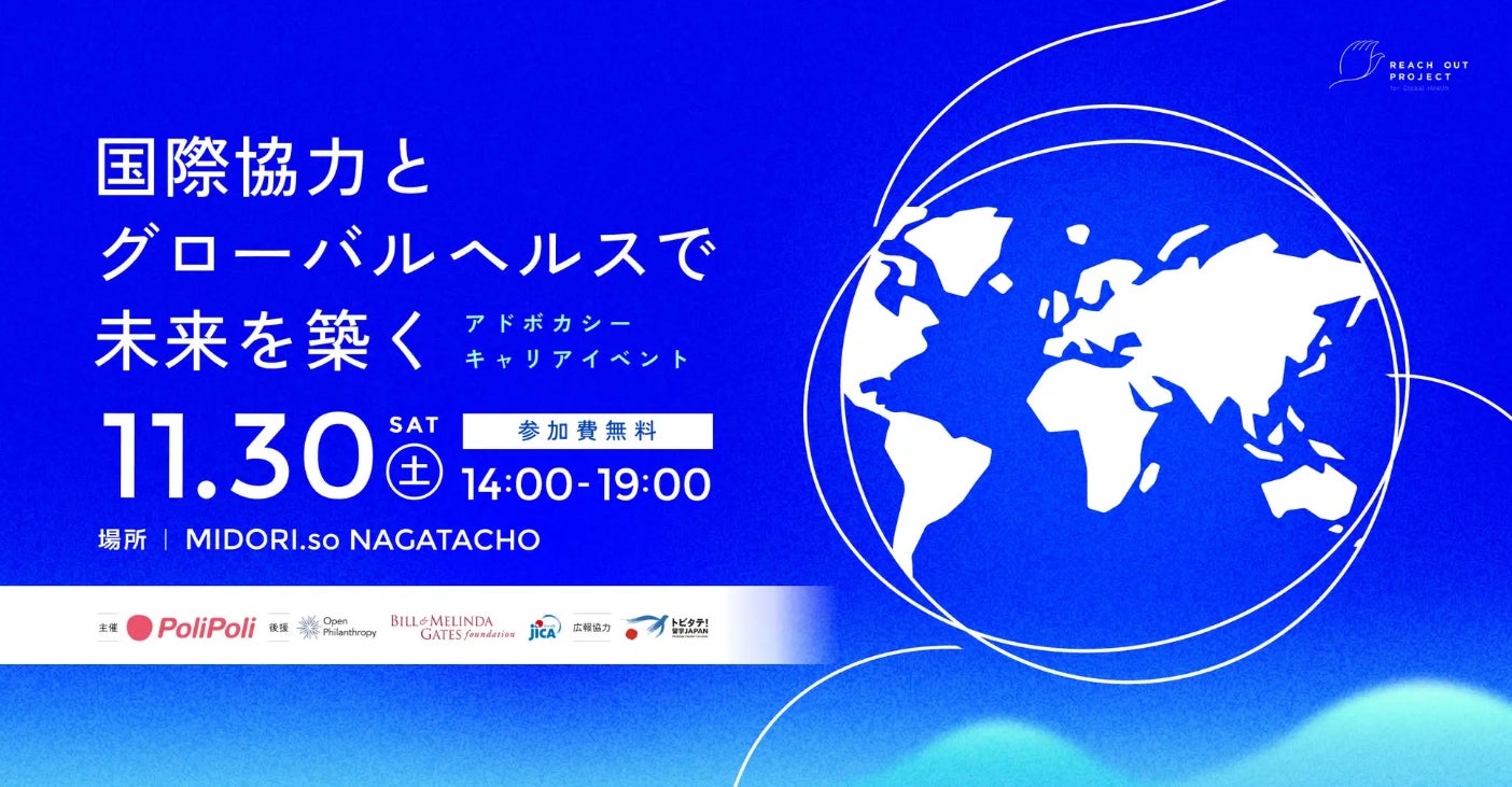 株式会社PoliPoliでは「Reach Out Project」の関連イベントとして、国際機関・民間セクターでアドボカシーに取り組むゲストのトークセッションやユース団体の活動紹介を通じて、具体的なキャリアパスを提供するイベントを開催します。