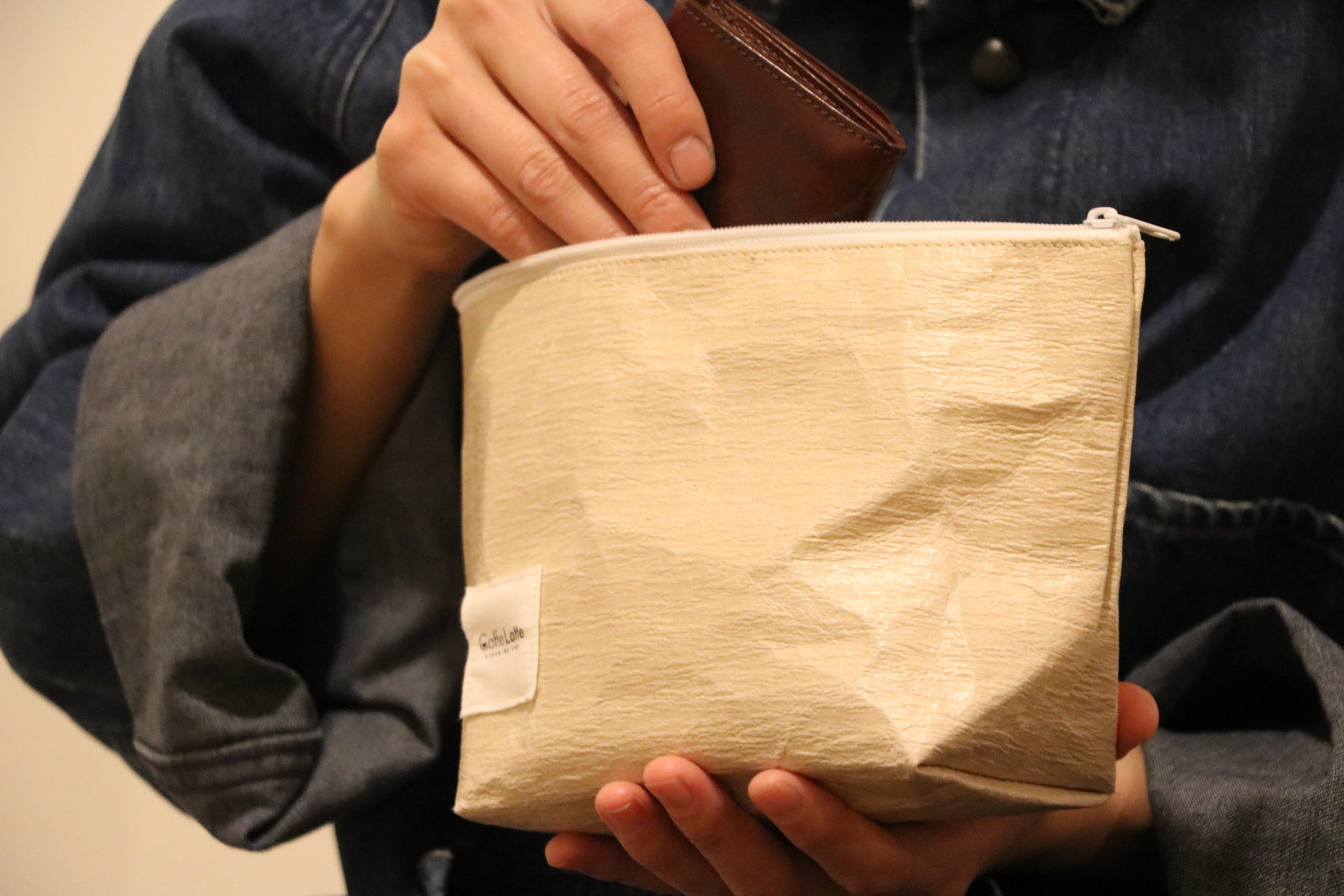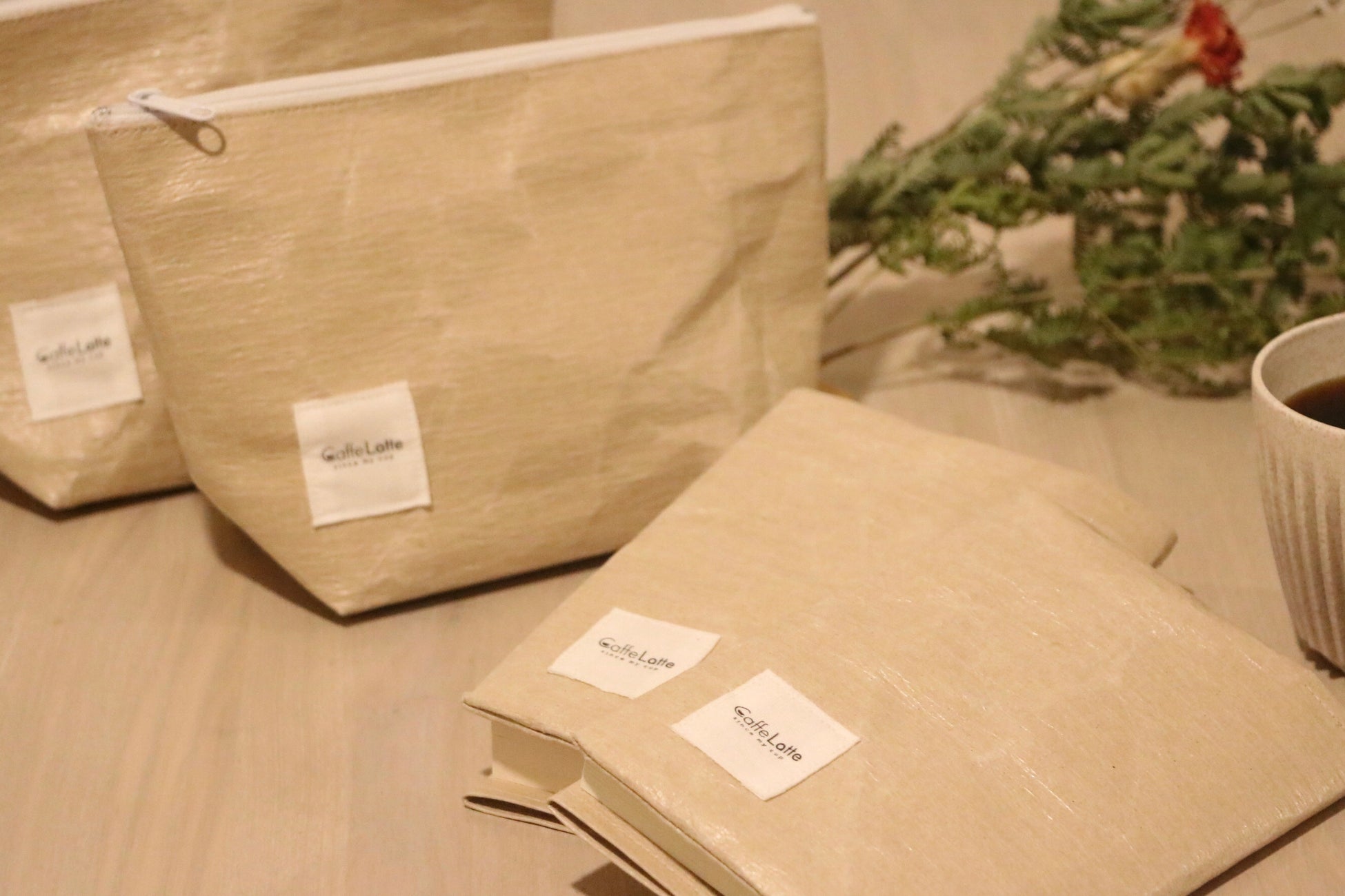 コーヒーカスと牛乳パックでつくる再生紙ブランド「Caffe Latte」からポーチやブックカバーが完成