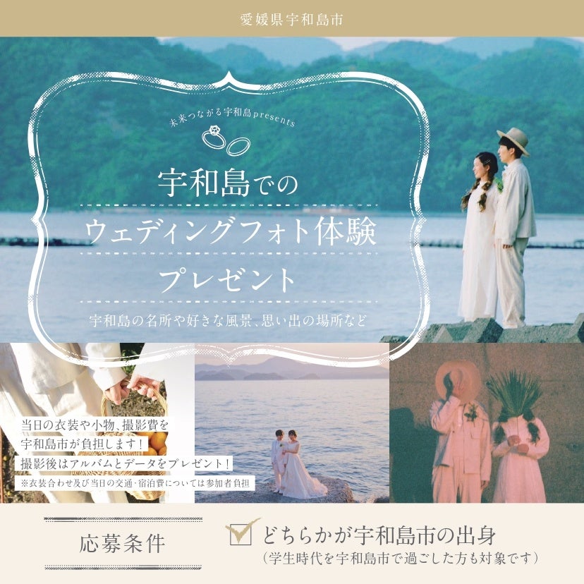 宇和島市役所は、Uターン促進事業の一環として、「現在宇和島市外にお住まいの、すでに結婚しているご夫婦または近くご結婚を予定されているカップル」を対象にしたウェディングフォト体験プレゼント企画を2022年10月19日より開始いたします。本企画では、お二人にまつわる宇和島の名所や好きな風景、思い出の場所で大切な人と過ごす優しいひとときを写真に残します。