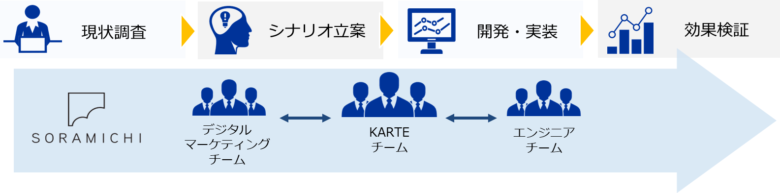 WEBコンサルティングやデータ分析、システム構築を得意とするSORAMICHIは、今回、「KARTE」の導入をご検討中のお客様に向けて、現状分析・課題抽出からシステムの開発・実装、導入後の効果検証までのプロセスを、一気通貫でサポートするサービスを提供開始いたします。