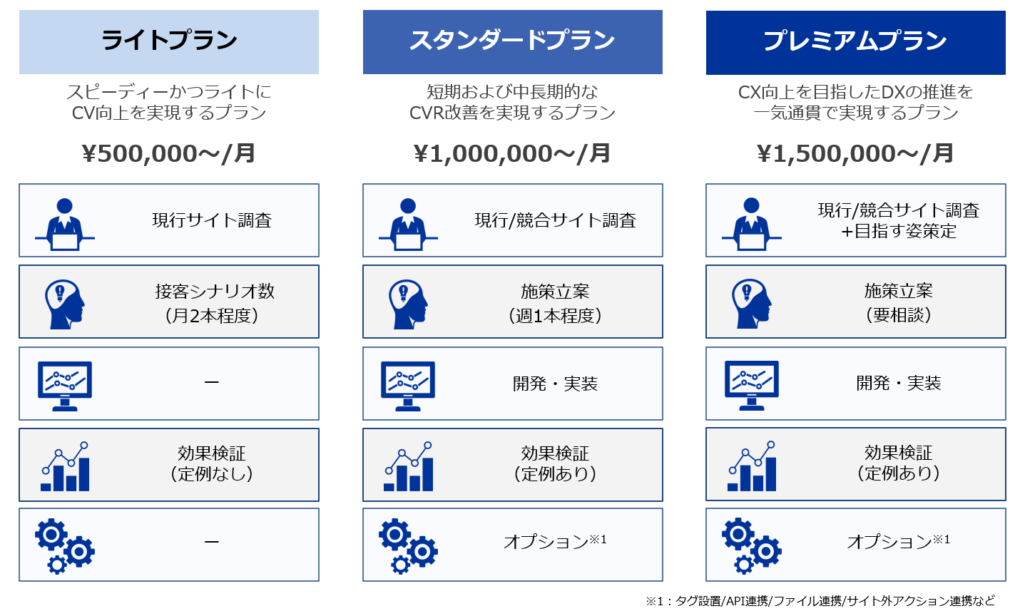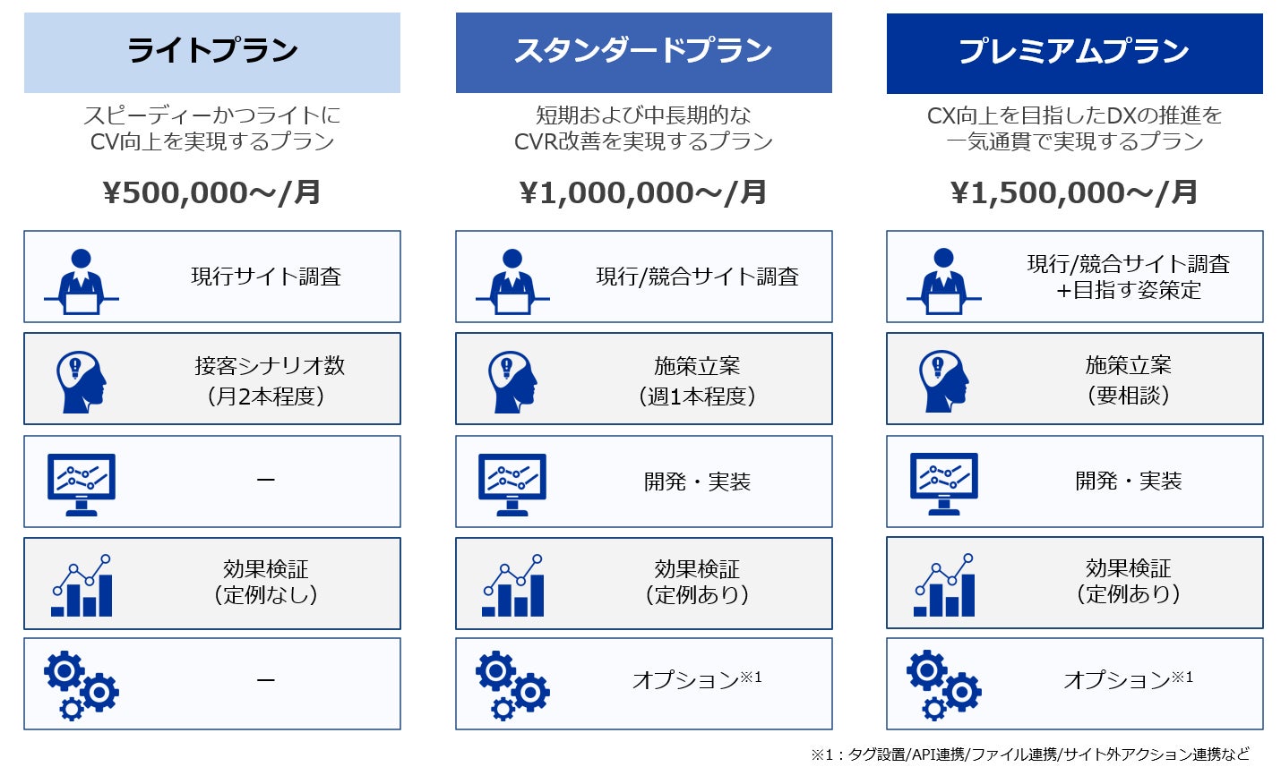 短期的にコンバージョン率の改善をお考えのお客様から、CX(顧客体験)の向上を実現することで、競合他社との差別化を図りたいとお考えのお客様まで、それぞれの目的に応じたご利用が可能です。