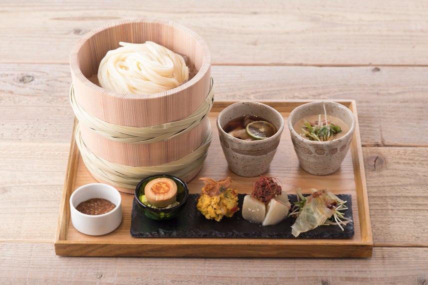 また併設する「しょうゆ蔵のレストラン」では、”しょうゆの美味しさを出汁で伝える”をコンセプトにした自家製めんのうどんメニューを中心に展開。木桶職人がハンドメイドでつくったちいさな木桶にうどんが入った「木桶うどんおばんざいセット」やしょうゆの味比べができる「食べ比べうどん」、またしょうゆのソフトクリームや自社工房で製造する「しょうゆバウムクーヘン」などのスイーツも楽しめます。