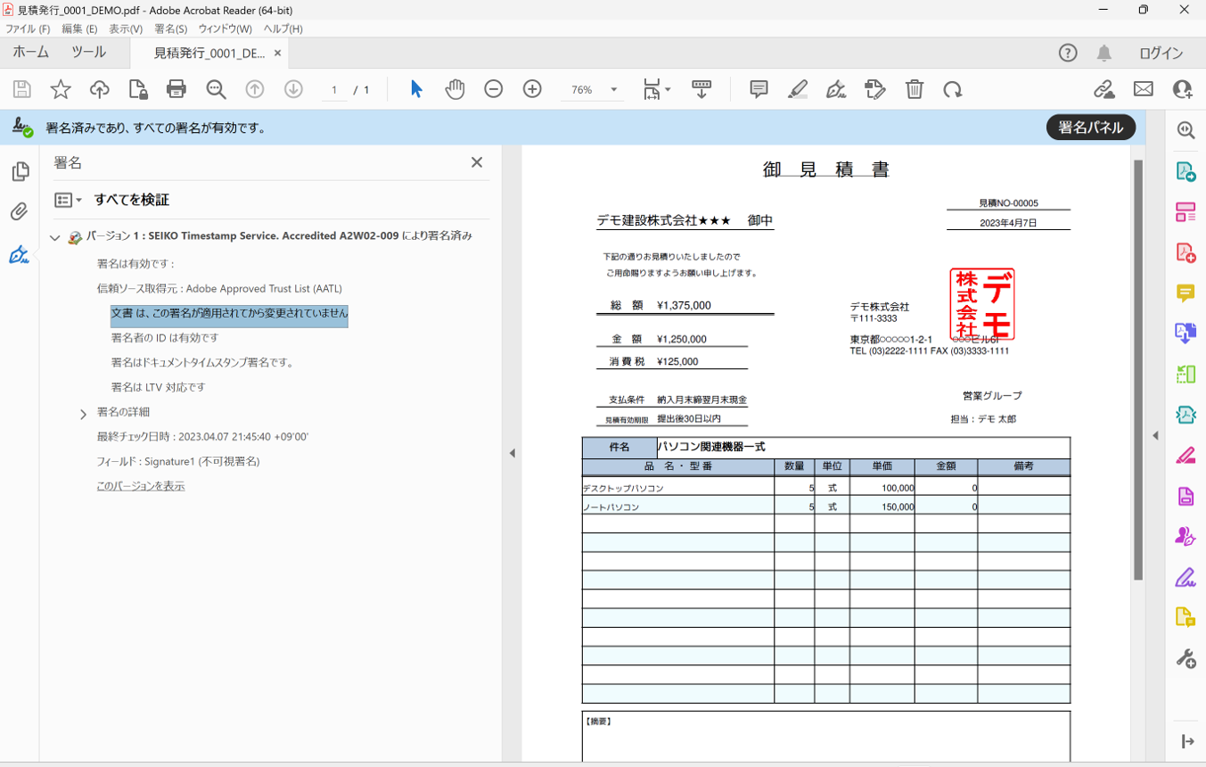 添付のPDFにタイムスタンプを付与する事が出来ます。
