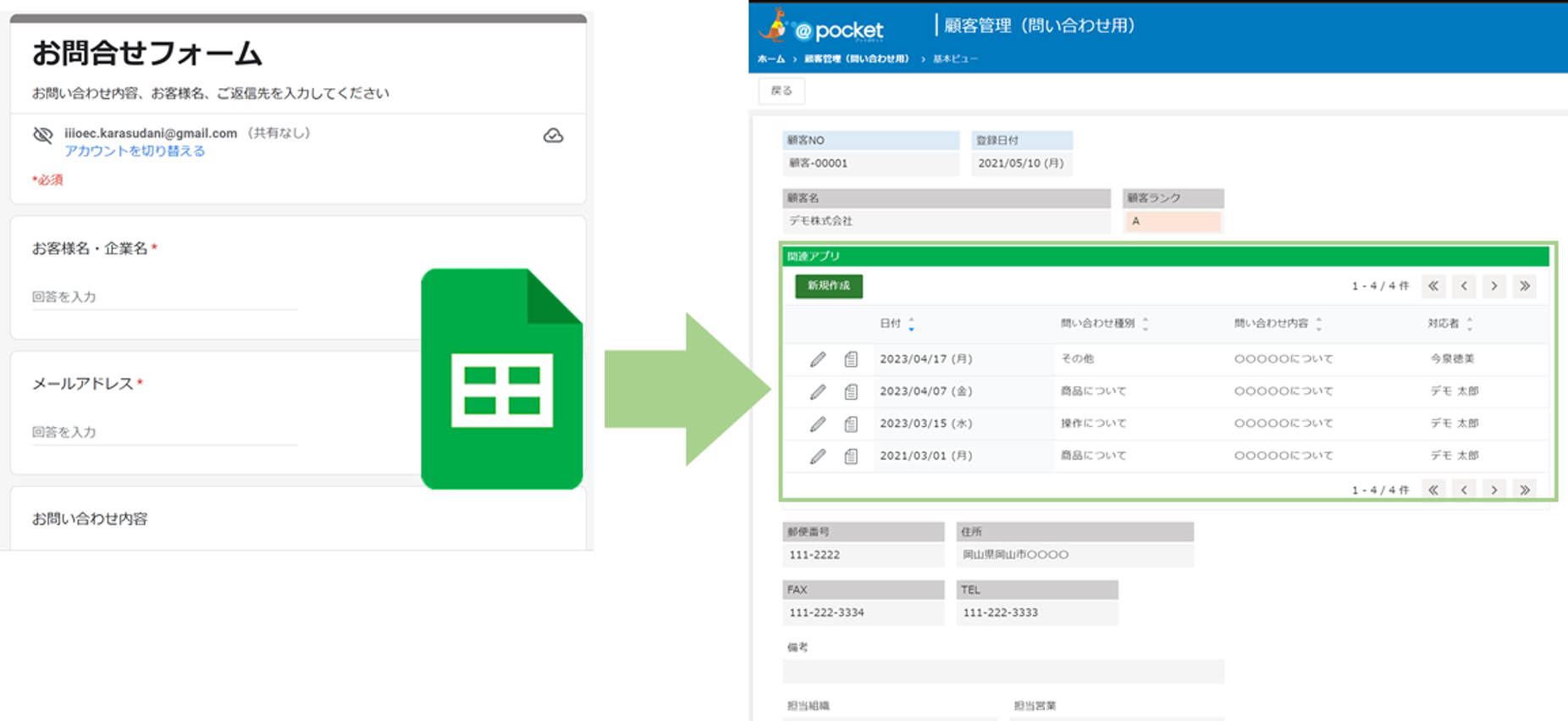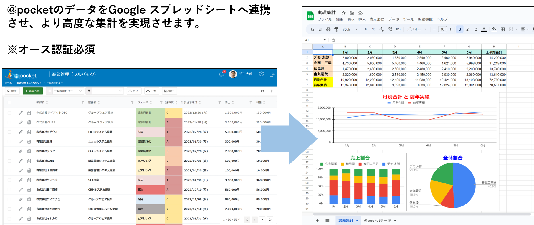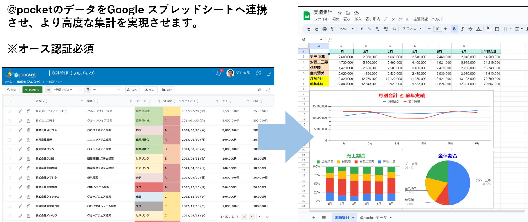 Google スプレッドシート内の任意のシートのデータと@pocketのアプリデータを連携可能です。