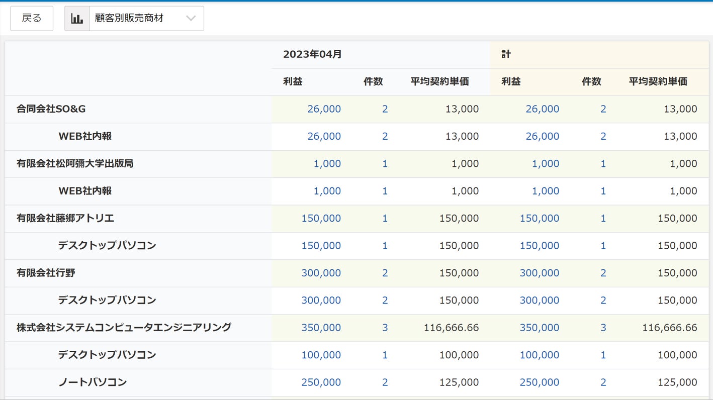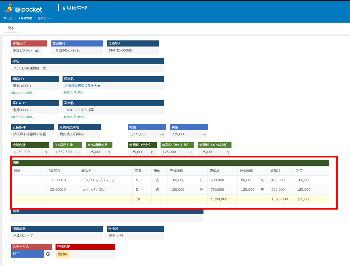 見積書等の明細を別アプリに取込んで商材の販売状況等の集計・分析に活用出来ます。