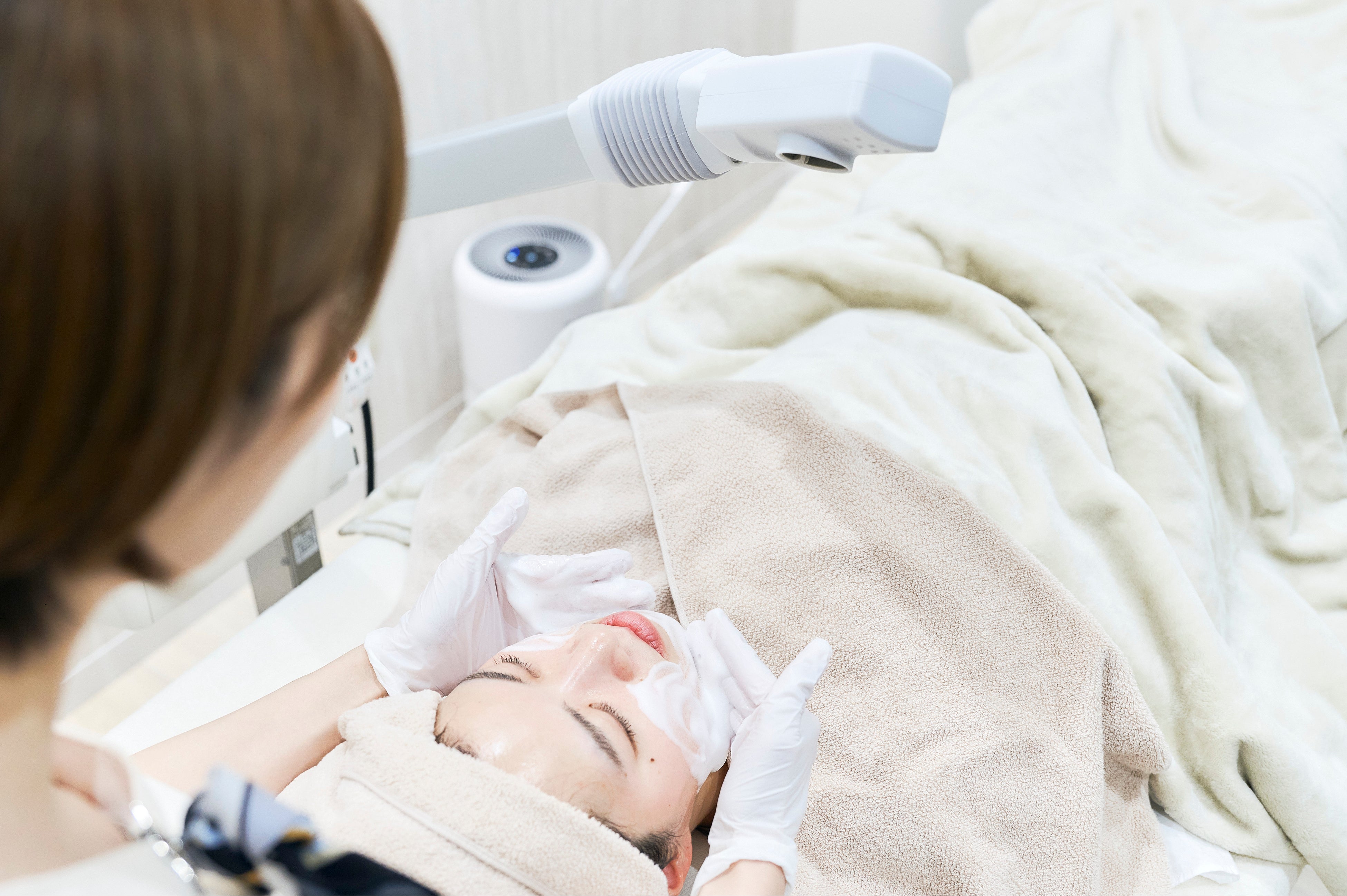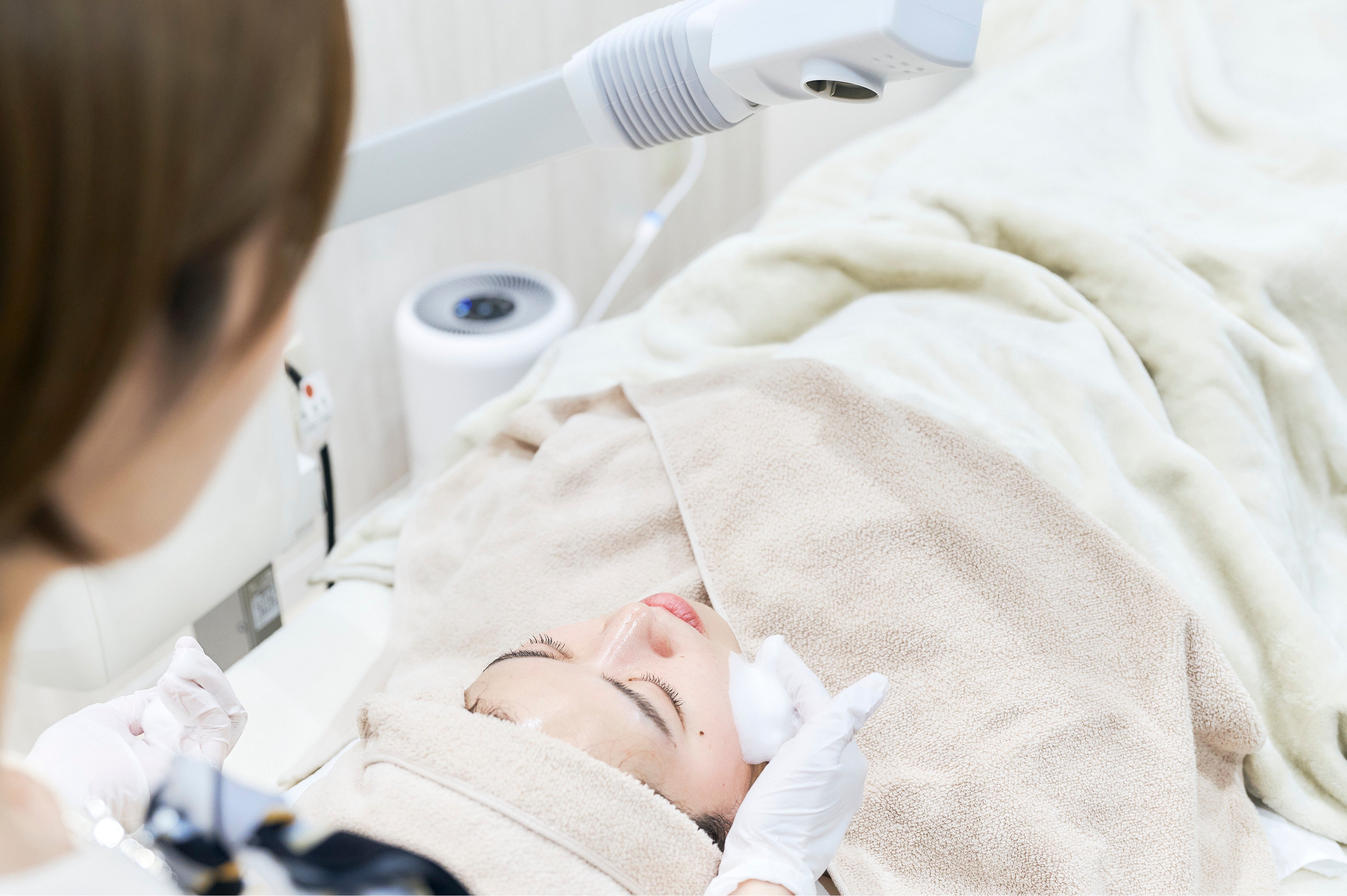 当院では、クレンジング・洗顔は微細なスチームを使用し、スタッフが丁寧に行います。お肌の汚れをしっかり落とした後に治療に入ります。