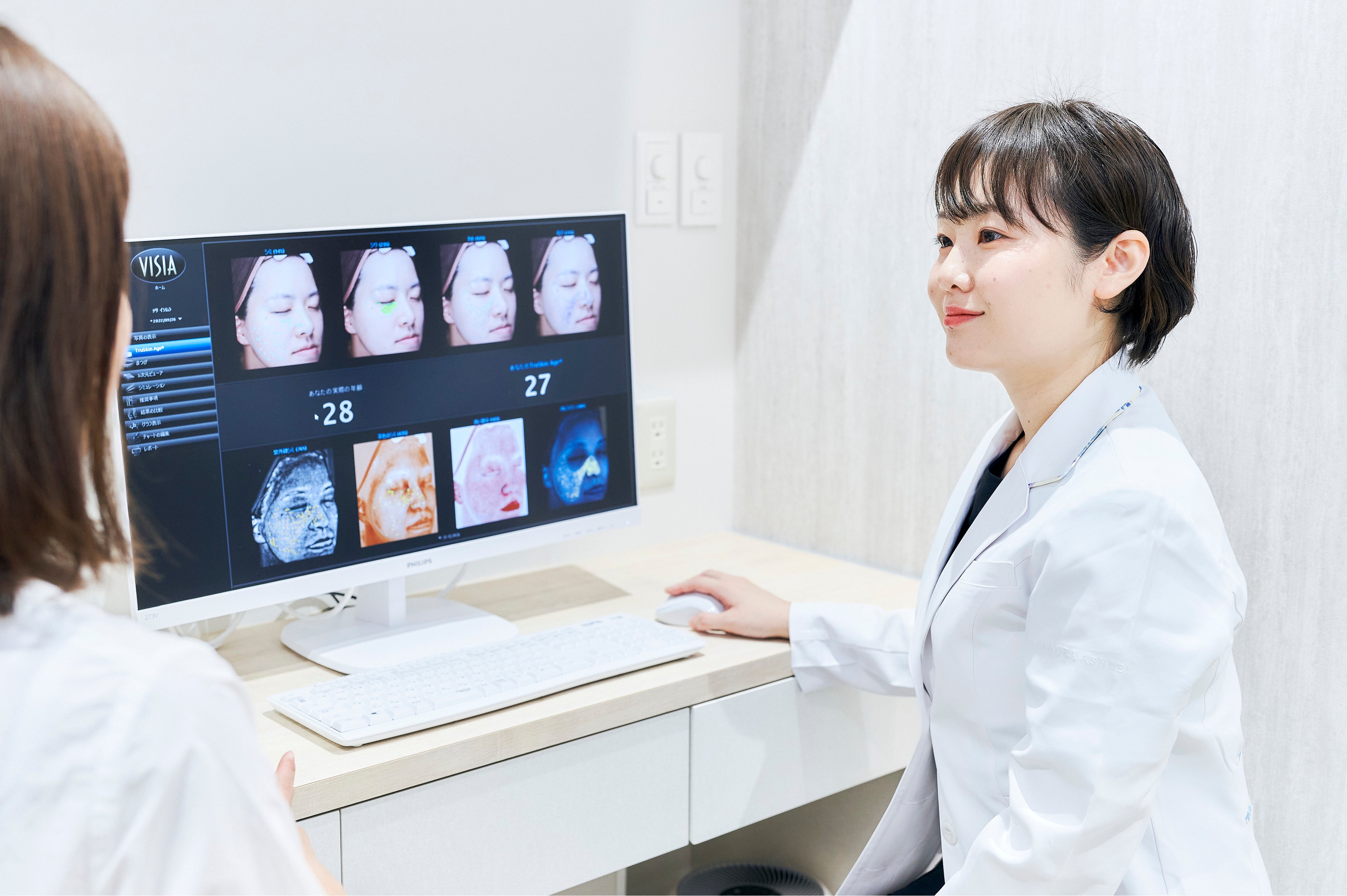 肌ドックでは、お悩みをお伺いし、肌診断機VISIAによる撮影と皮膚科医による診察、お悩みにあったメニューのご提案を行なっております。