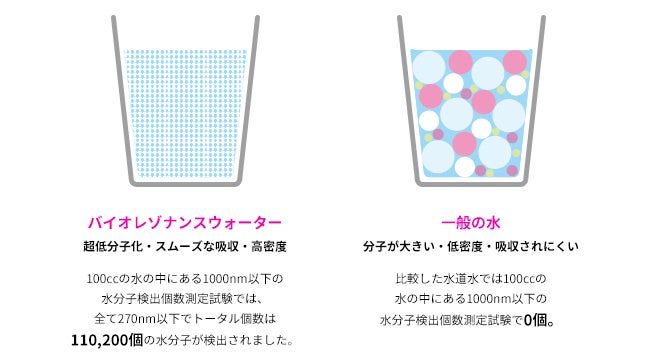 水道水の約1/100,000,000の超低分子化に成功した「バイオレゾナンスウォーター」は、水の分子サイズが小さいため、細胞の隅々にまで水を浸透させることができるのです。