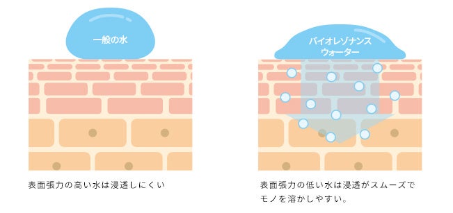 また、38°C程度のお湯は、表面張力が低いため物質が溶けやすく、からだへの水分吸収がスムーズになると言われていますが、「バイオレゾナンスウォーター」は表面張力が70.1mN/mで、常温でも38°Cのお湯と同程度の表面張力なので、油などの物質を溶かしやすい性質を持ち、見た目のスッキリもサポートします。