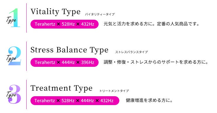 「バイオレゾナンスウォーター」は、ソルフェジオ周波数を目的に応じて組み合わせた3タイプからお選びいただけます。