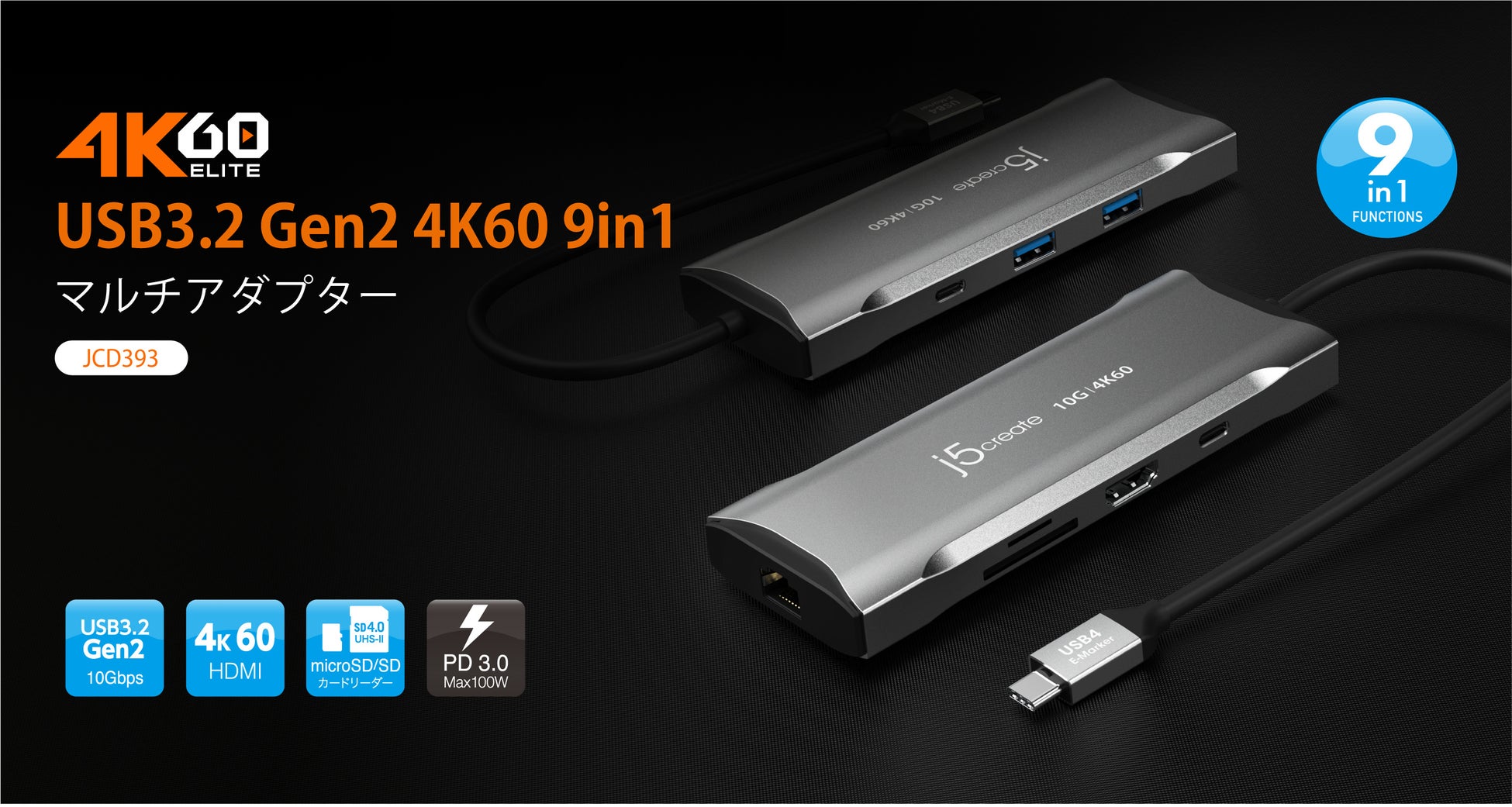 j5create、『USB3.2 Gen2 4K60 9in1マルチアダプター JCD393』・『USB デュアルHDMI ディスプレイアダプター JCA365』を2月25日に発売