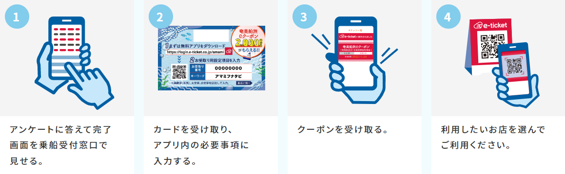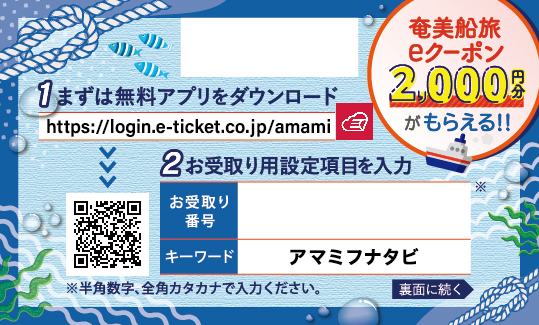 ●奄美船旅eクーポンについて:1セット2,000円分(500円券×4枚)の金券として使える電子クーポンです。奄美群島内の飲食店・お土産店・観光施設等約90店舗にて料金お支払い時にご利用できます。