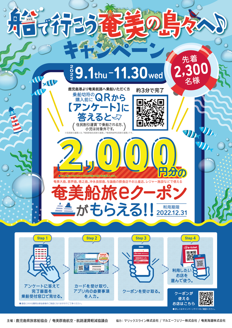 鹿児島発奄美群島を結ぶフェリーでの船旅のPR及び利用促進、また、奄美群島内の地域の活性化を目的に乗船切符の購入前に簡単なアンケートに答えると先着2,300名様へ2,000円分の奄美船旅eクーポンをプレゼントする周遊観光キャンペーンとなります。