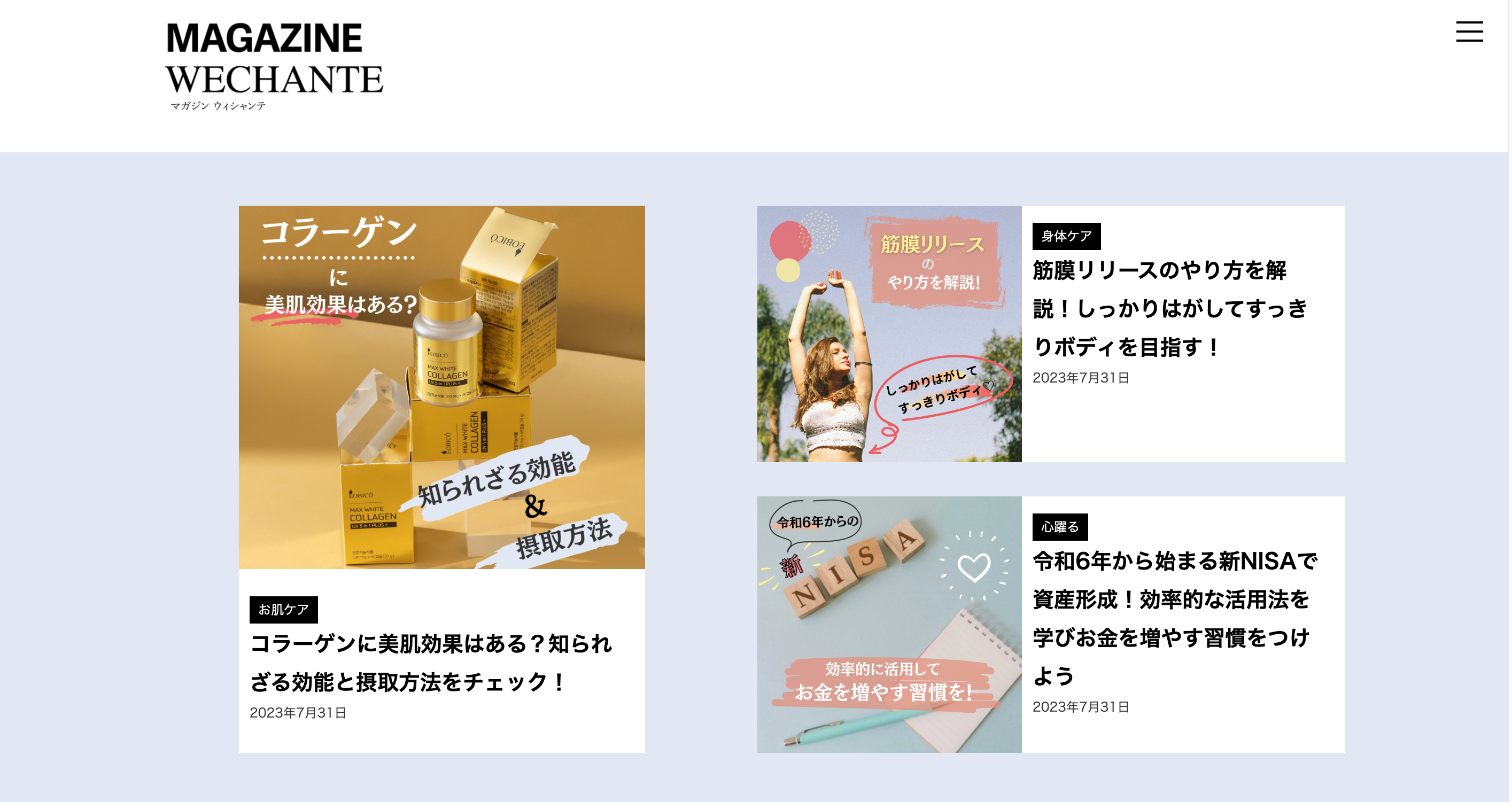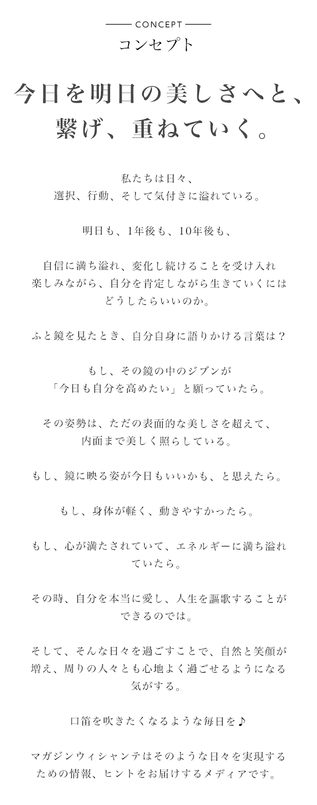 「今日を明日の美しさへと、 繋げ、重ねていく。」をコンセプトに、女性の肌、身体、気持ち、をテーマにエイジングケア情報について毎週いち早くお届けしています。