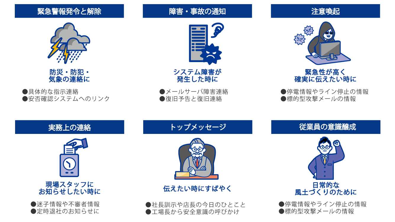 緊急連絡や障害通知などの緊急性の高いメッセージなどを早く・確実に・かんたんに届けます。