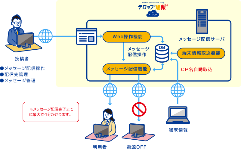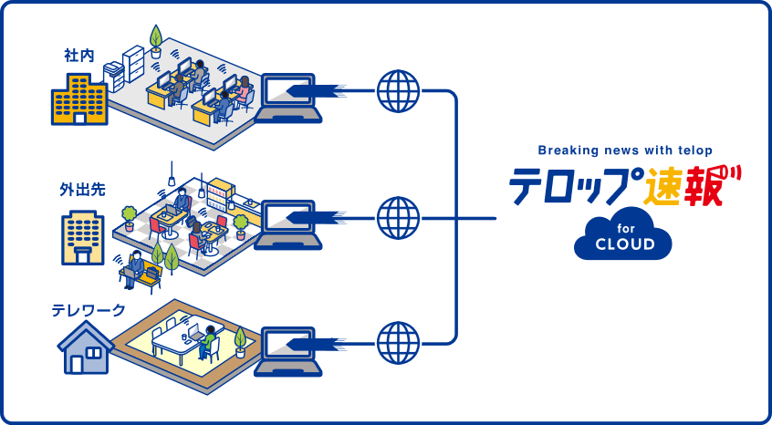 「テロップ速報 for CLOUD」は、時間外勤務の抑制につながる効果的なメッセージや緊急性の高い障害通知などを、インターネットに接続されているパソコンへテロップとして一斉通知できるアプリケーションです。