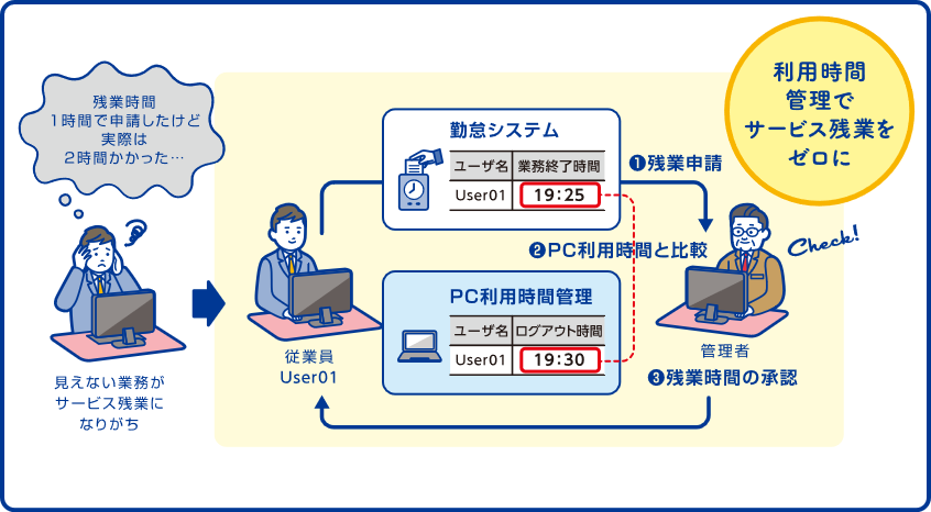 オプションの「PC利用時間管理機能」では、従業員の作業時間を把握して、サービス残業の有無を確認。該当ユーザーへメッセージを配信することができます。