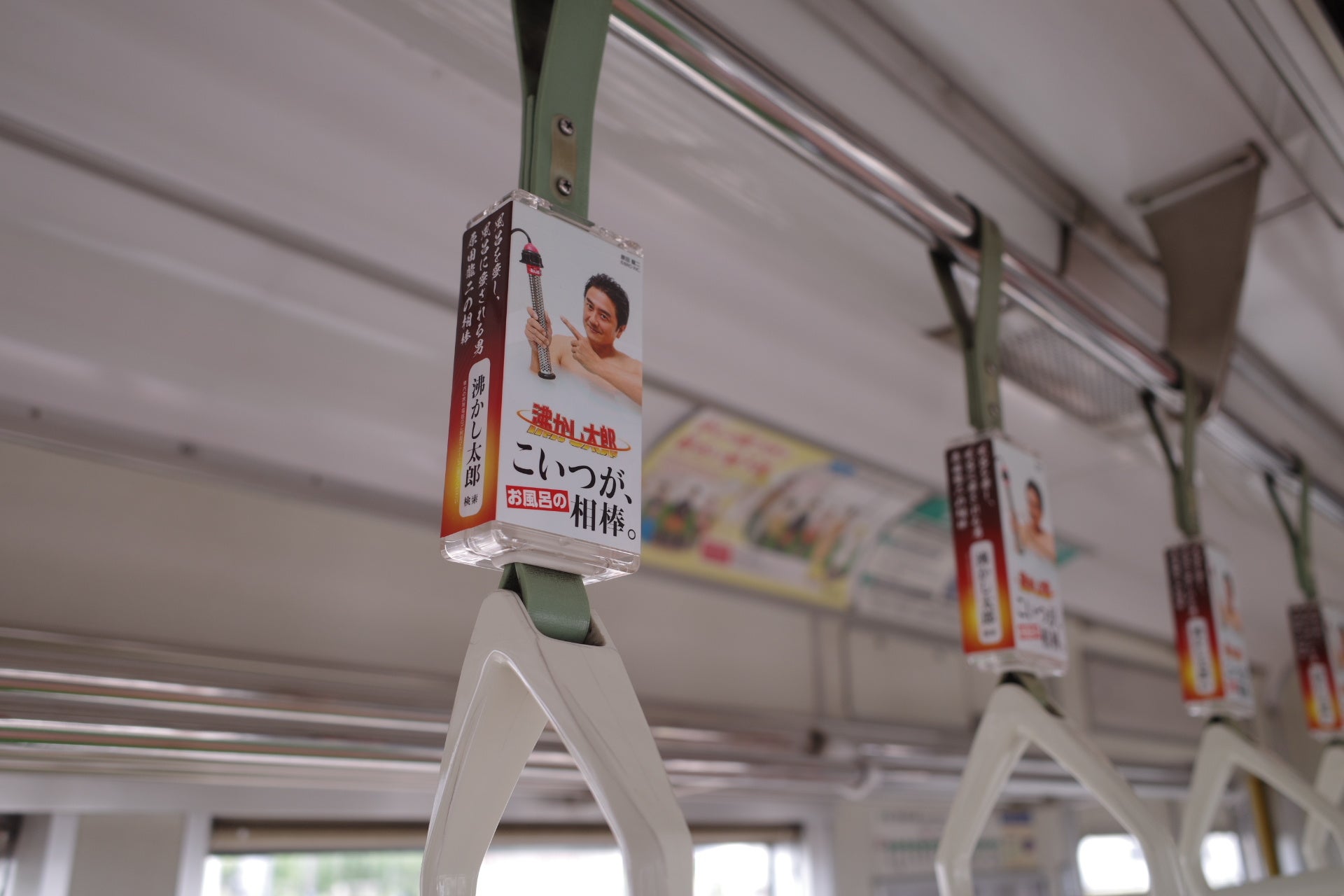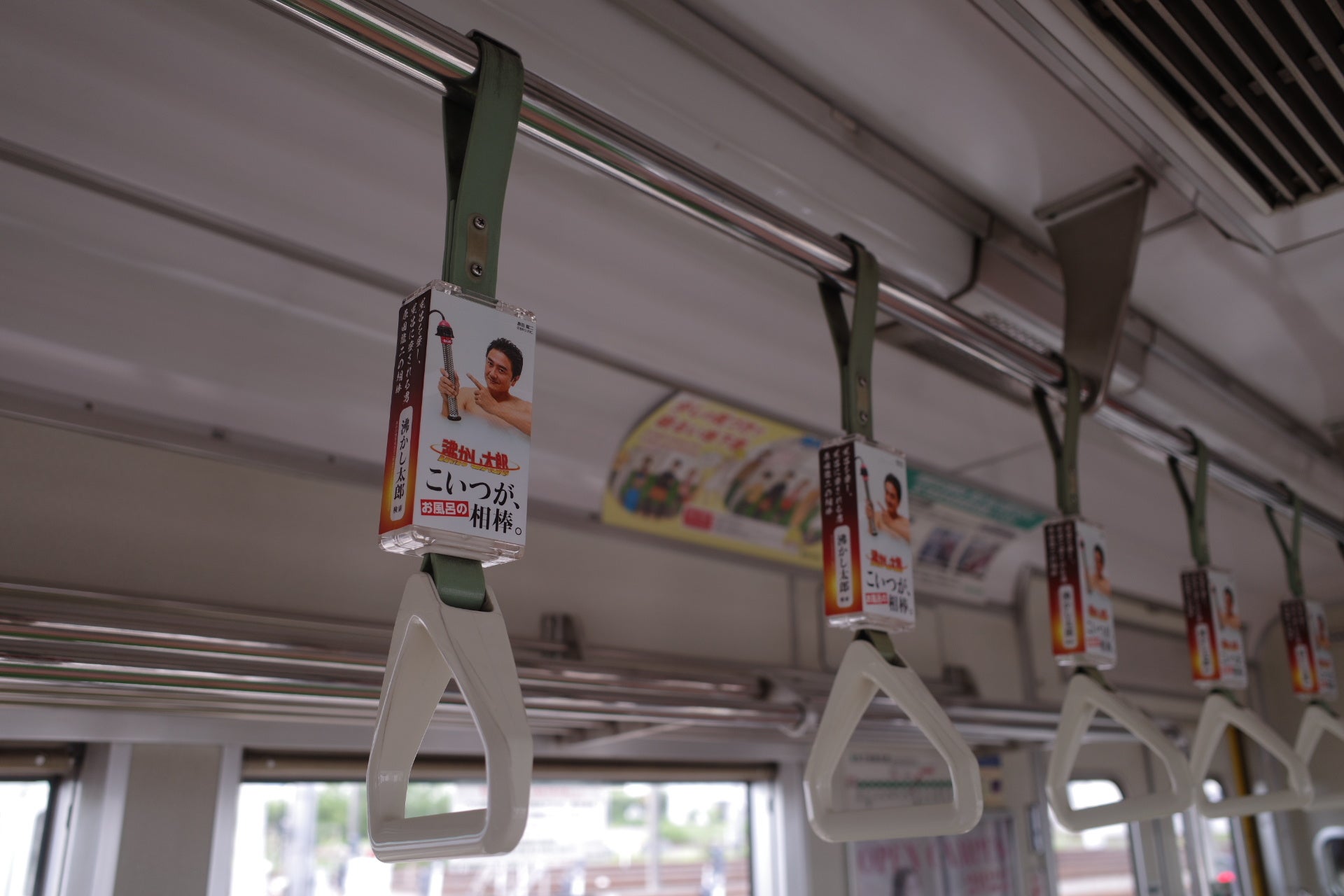 自称“温泉俳優“、お風呂大好きタレントの原田龍二さん×「沸かし太郎」のタイアップ広告が、京都市営地下鉄つり革を1年間ジャック!