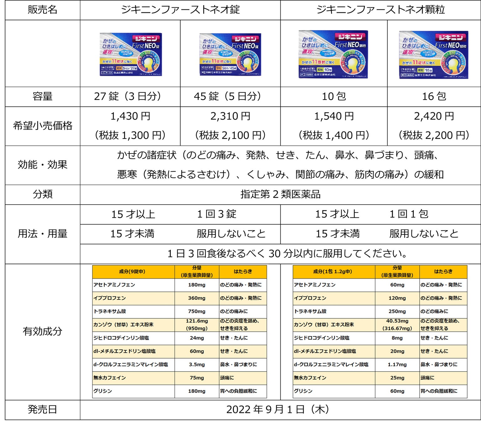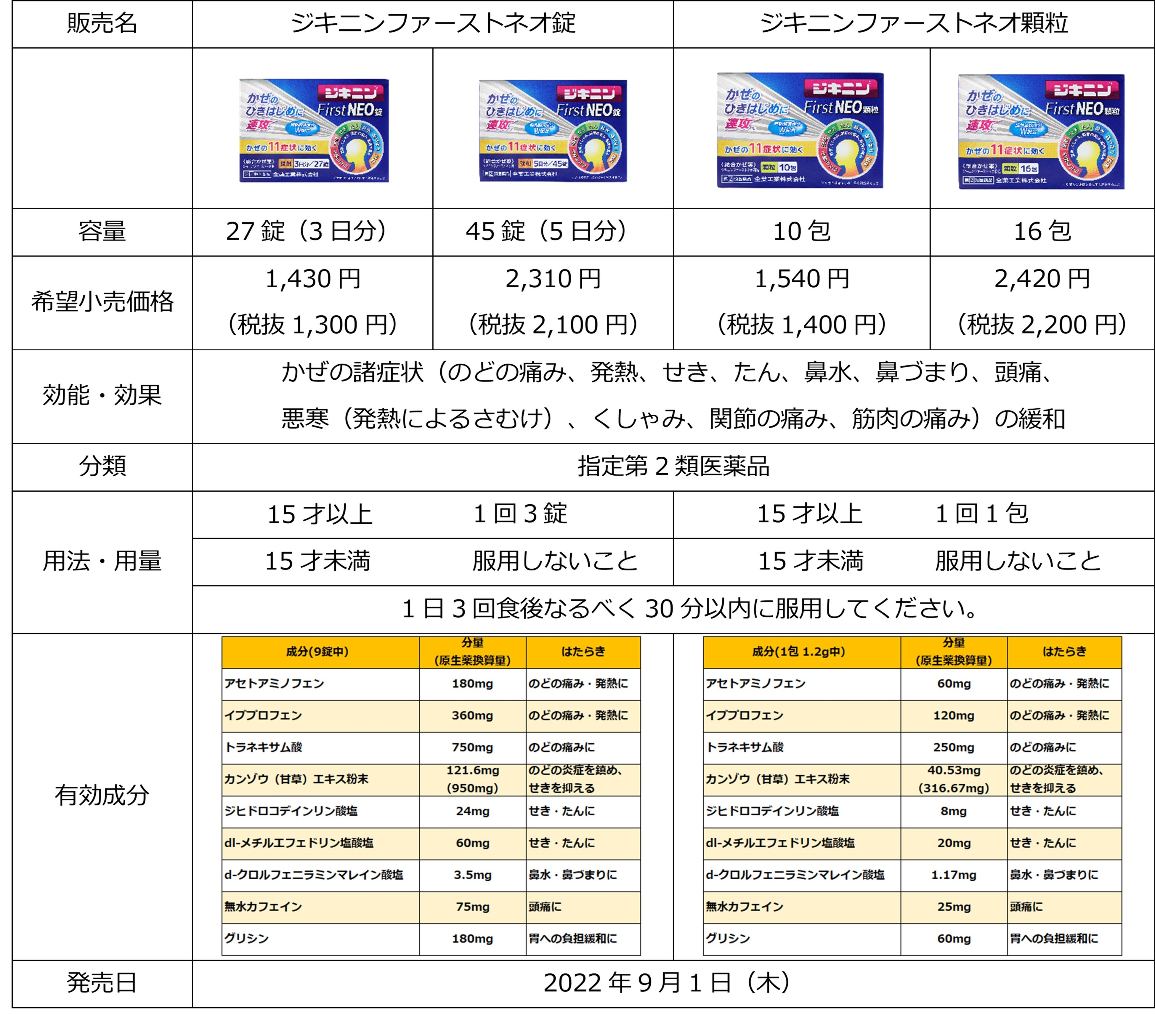 全薬工業株式会社(本社:東京都文京区)は、総合かぜ薬「ジキニンファーストネオ錠(指定第2類医薬品)」、「ジキニンファーストネオ顆粒(指定第2類医薬品)」を 9 月 1 日(木)より発売します。
