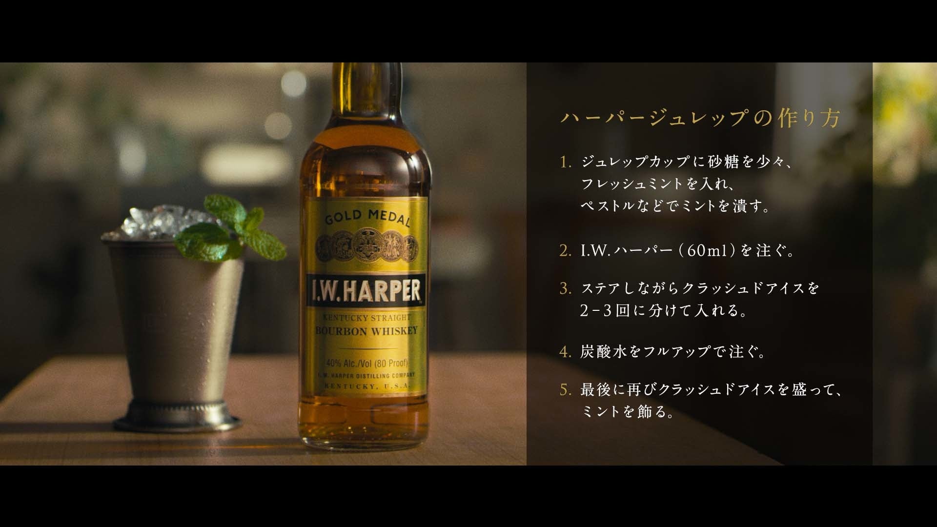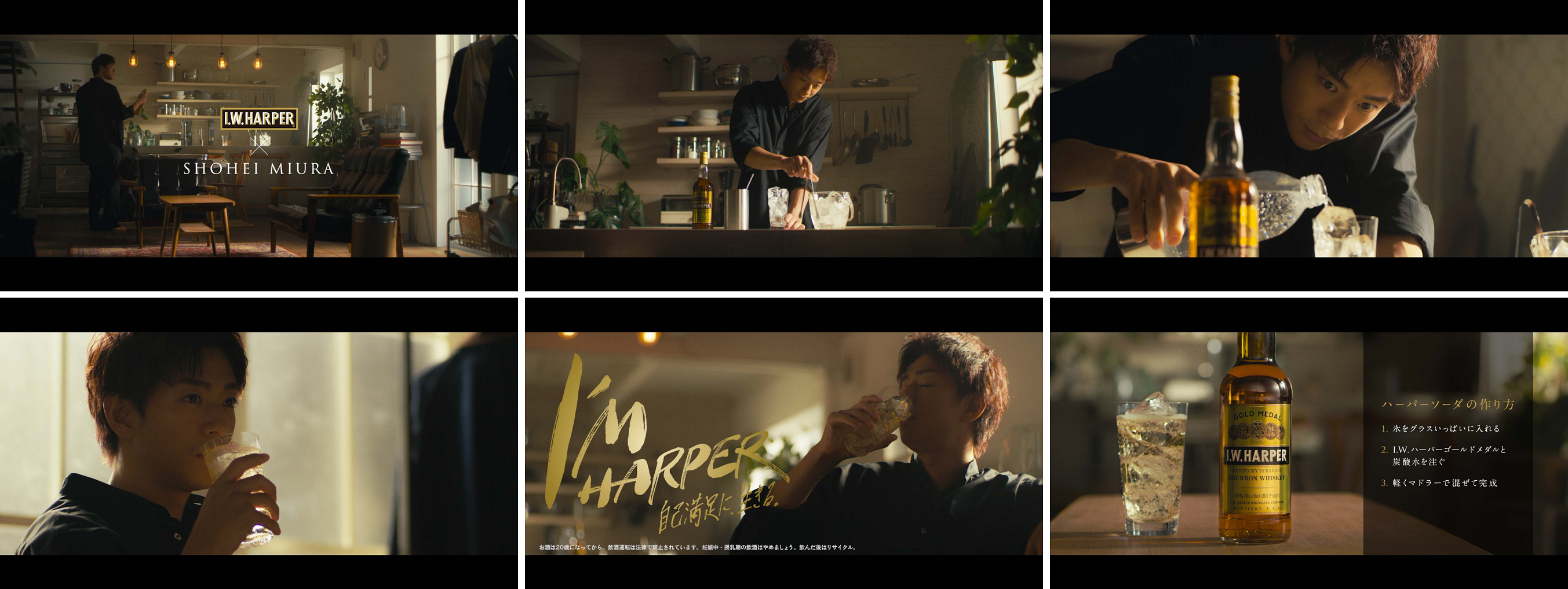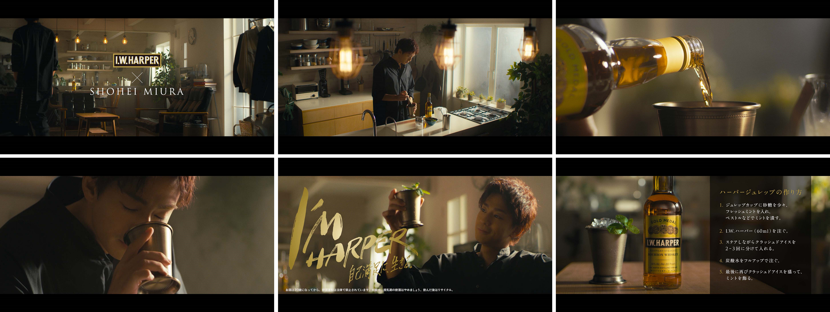 そして今回、ブランドアンバサダーの三浦翔平さんを起用したWEBムービー「ハーパージュレップ試さない?」篇・「ハーパーソーダにしよう。」篇を公開。三浦さんが「I.W. HARPER」を使った新しい飲み方“ハーパージュレップ”と、定番の“ハーパーソーダ”を作っていく過程を追いかけたレシピ動画となっており、一つ一つの工程を楽しみながら作り、笑顔でドリンクを味わう三浦さんのリラックスした表情が見どころです。