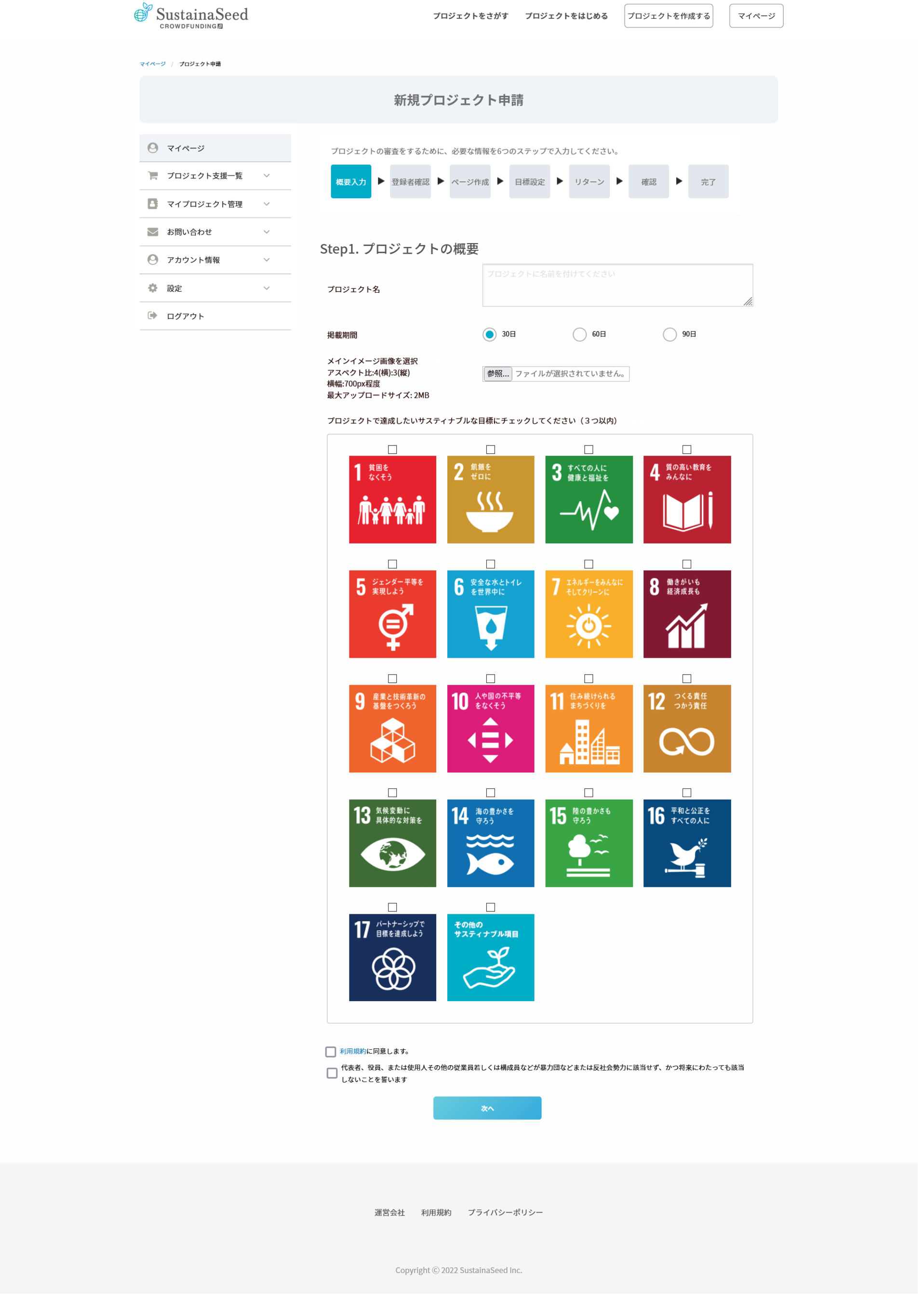 プロジェクトの内容は、サスティナビリティを考慮している事が条件で、指標としてSDGsの該当目標を選択し、それに沿った説明や想いを語る仕様となっております。