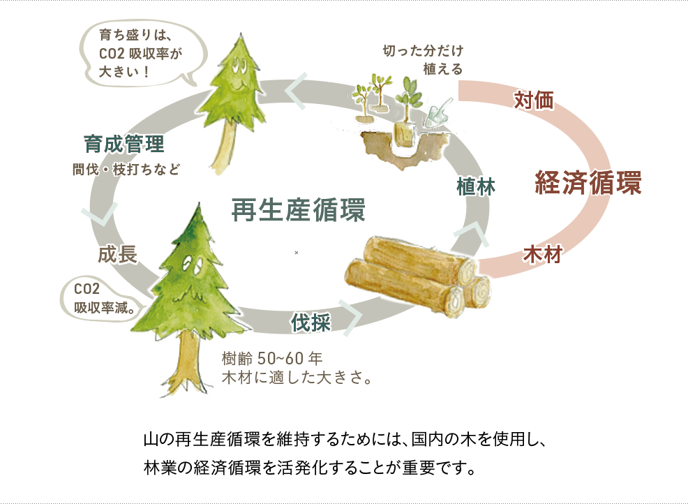 少しずつ上昇しつつも、まだ40%程度の国産材自給率。国産材を使い、使った分を植林することで、経済循環と再精算循環による森林サイクルを整え、CO2削減・吸収に寄与します。