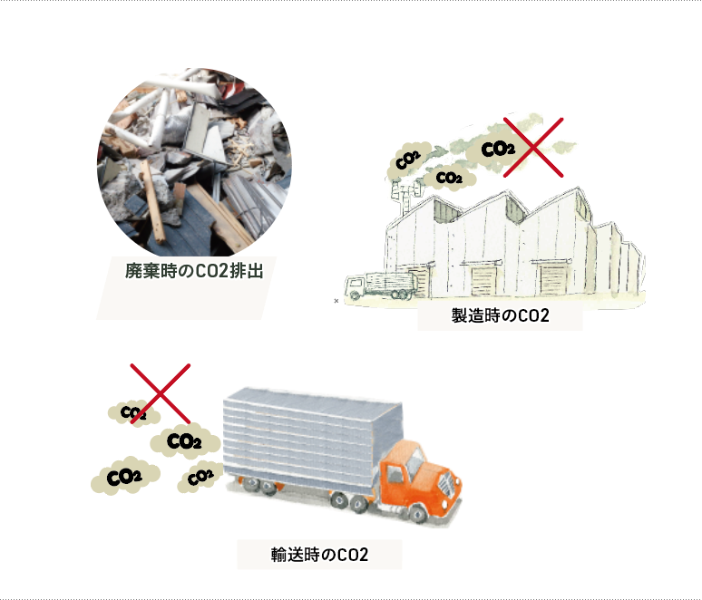 地域の自然素材を使用することで、材料の製造・輸送時、そして廃棄される際のCO2排出量をも削減することができます。