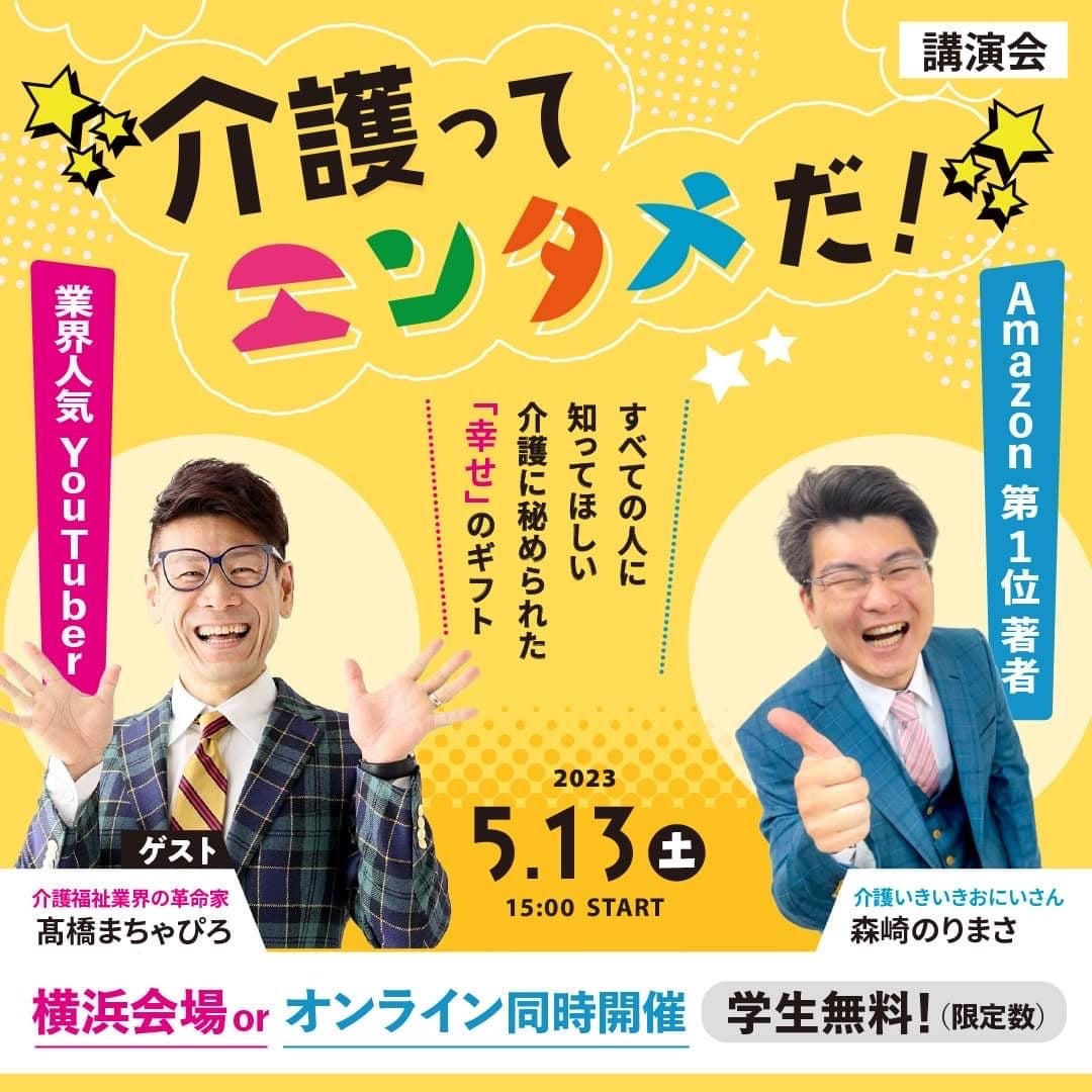 Amazon ランキング人事部門1位を獲得した『退職者を出さない管理者が必ずやっていること』 の著者、森崎のりまさ氏と、『介護福祉業界の革命家』で人気YouTuberの髙橋まちゃぴろ氏が、介護の未来を明るく語るトークイベント!を開催。