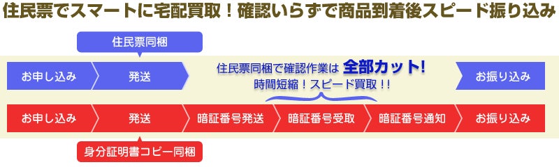 遠方のお客様にもタイムリーなお買取を「郵送買取」にて実施いたしております。住民票をお品物と一緒に送るだけで手間なくスムーズにご査定およびお振り込み差し上げます。もちろん送料は無料!着払いでご発送ください。