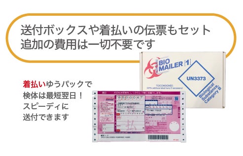 検体採取キットの他、検体返送用の専用ボックス、ゆうパックの着払い伝票など、PCR検査に必要なものをすべてパッケージ化しています。いつでも、どこからでも手軽にご利用いただけます。