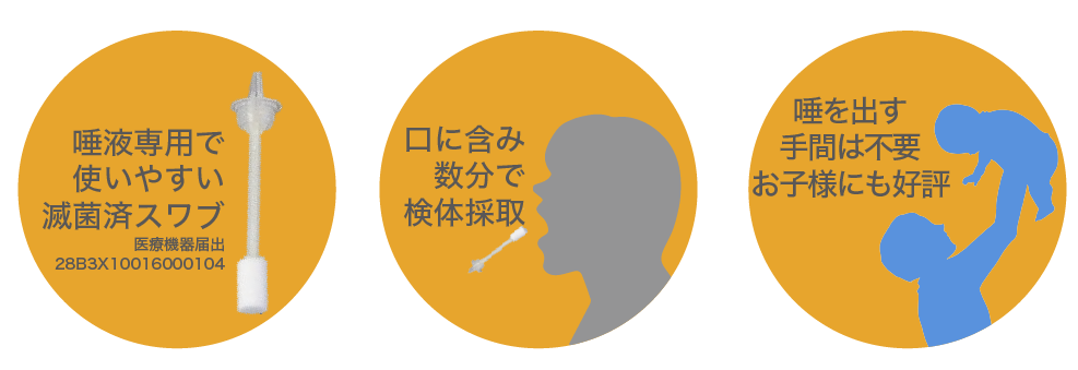 数分で検体が採取できる唾液専用のスワブを採用。必要な量が取れるよう設計されていますので、唾液を出しにくい高齢者やお子様にも好評です。(医療機器届出番号28B3X10016000104)