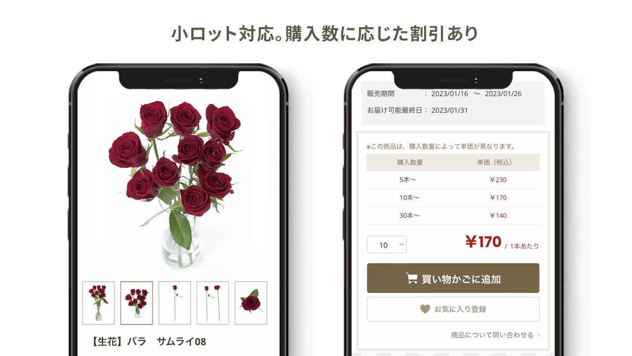 フラワースミスマーケットでは全ての花を小ロット(5本~)でご購入いただけます。また、一度にたくさん仕入れたい方も、お買い上げ本数に応じて割引価格でご購入いただけるボリュームディスカウントでお得にご利用いただけます。