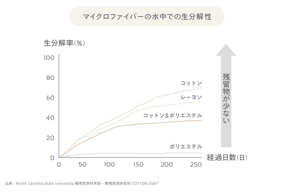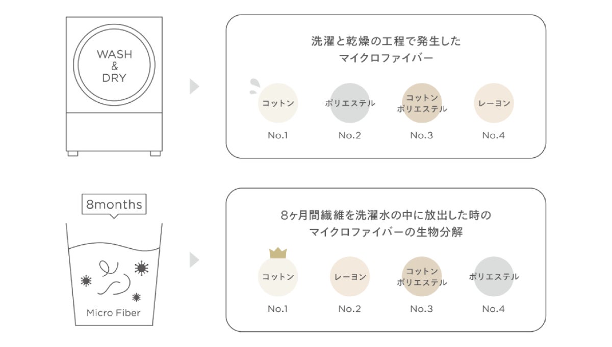 コットン、ポリエステル、レーヨン、コットン・ポリエステル混の4種類の繊維を、洗濯と乾燥の両方の工程で比較したとき、最も多くのマイクロファイバーが発生したのはコットンでした。