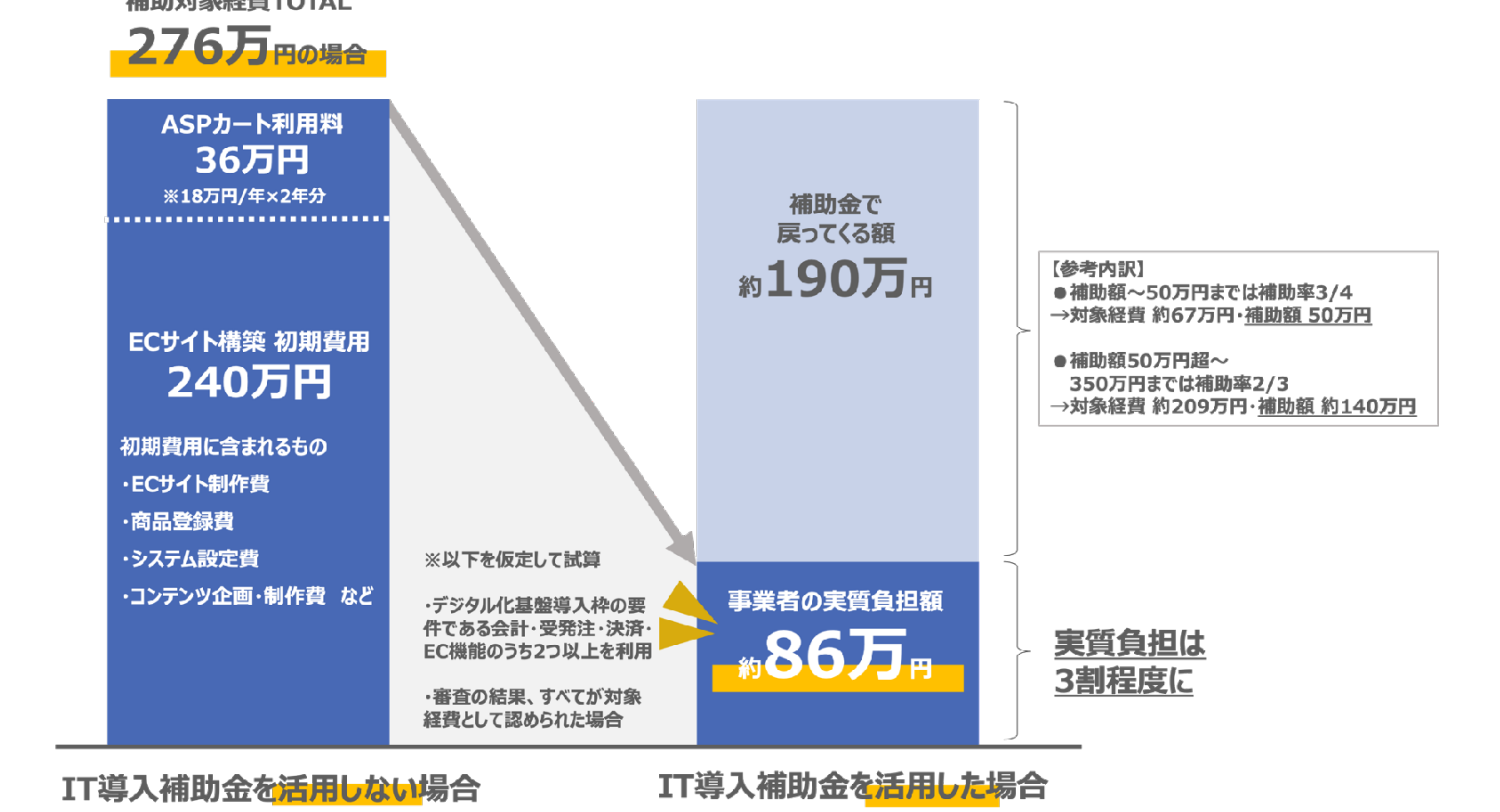 例えば、ECサイト構築費用とASP利用料の合計が276万円だった場合、事業者の実質負担額は約86万円となります。