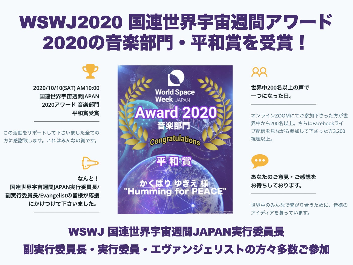 この活動は「日本で最も盛り上がったイベント」として2020年国連WSWJ音楽部門・平和賞を受賞。アメリカ国連本部に報告があげられました。