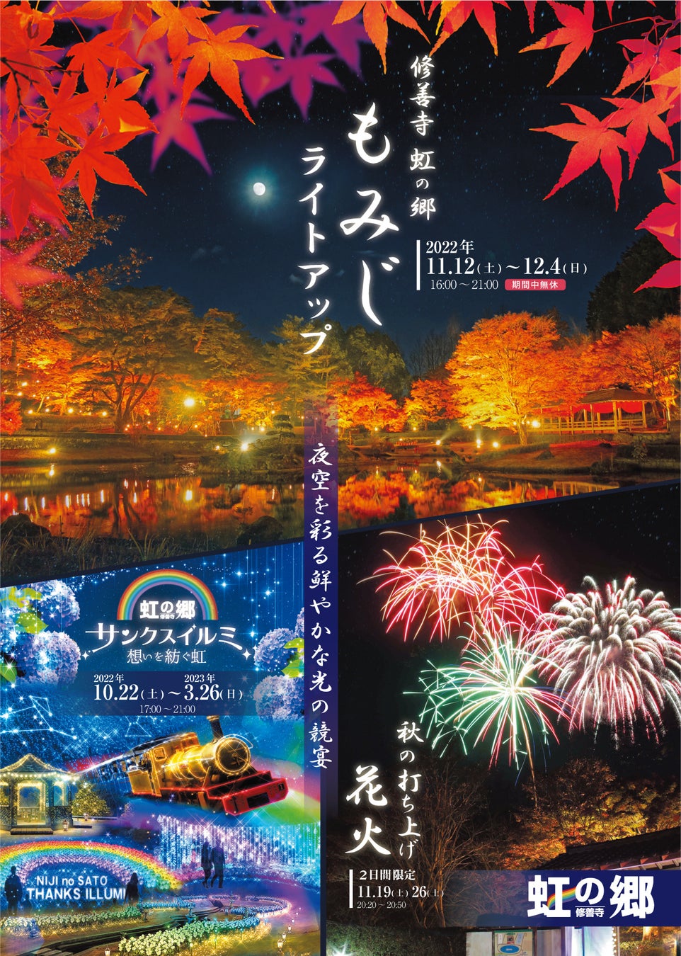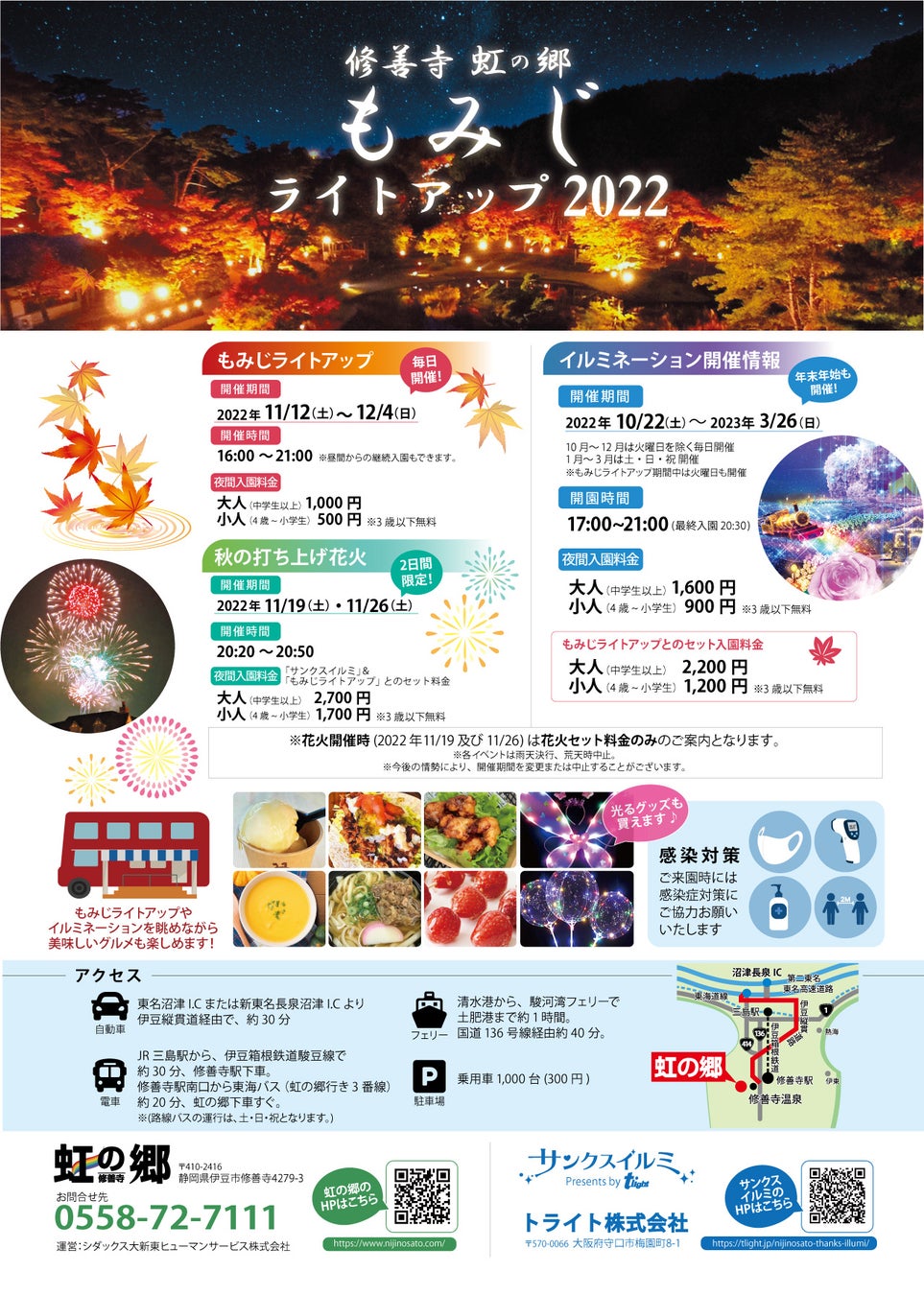 シダックスグループが受託管理する「修善寺虹の郷」では、11月中旬から12月中旬にかけて和風・洋風合わせて約2,000本の『紅葉』が見頃を迎えます。11月12日(土)から12月4日(日)の間『もみじライトアップ(夜間開園)』を開催します。今年で18回目を迎えるこのライトアップは、修善寺の晩秋の風物詩として毎年好評を頂いており、虹の郷の「日本庭園」菖蒲ヶ池の水面に浮かび上がる紅葉や、築150~300年の古民家が建ち並ぶ「匠の村」へと続く約1,000本のもみじ林などがライトアップされ、昼間とはまた一味違った幻想的な紅葉を演出します。11月12日(土)、13日(日)には、各日100基ものランタンが夜空を彩る「願いを込めて!虹の郷スカイランタン」、11月19日(土)、26日(土)には「秋の花火大会」も行われ、紅葉ライトアップとともに秋の夜空をより一層彩ります。また今年は、10月22日から開催されている大型イルミネーションイベント「サンクスイルミ ~想いを紡ぐ虹~」との初の同時開催となります。幻想的な紅葉ライトアップと大型イルミネーションをここ修善寺虹の郷でお楽しみください。
