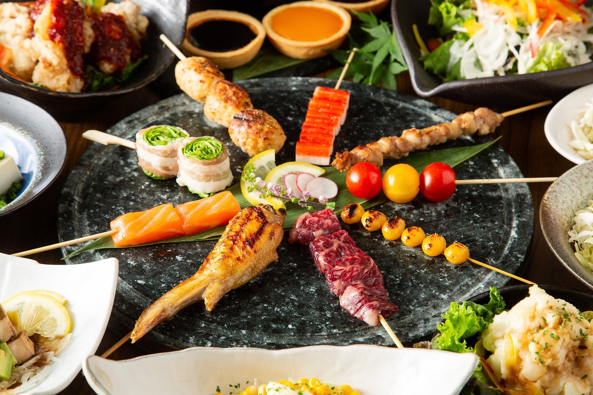 「トリミアムコース」は牛すじカルビ串、牛サガリ串、黒豚タンのねぎ塩にんにくだれ、海鮮串なども注文することができ、なんと串メニューと逸品メニュー合計92種、計153品目から食べ放題が選択可能!どのコースも焼き鳥だけでなく、肴メニューやサラダ、揚げ物、逸品料理、デザートなども食べ放題としてお召し上がりいただけるため、ご家族やご友人同士、お祝いごとなどの幅広いシーンでお楽しみいただけます。