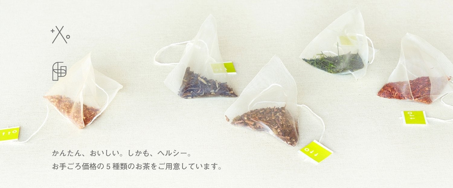 t to(ティートゥー)は、すべてティーバッグ。その理由は、手軽だから。ティーバッグなら、マグカップにいれてお湯を注ぐだけ。現代において「ほっと一息」つくシーンを作ってくれます。