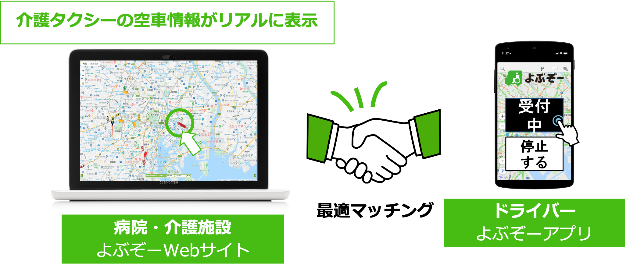 現在、首都圏における「よぶぞー」の実証実験として、大手介護施設様や病院様にご協力いただき「よぶぞー」による介護タクシー配車を進めております。