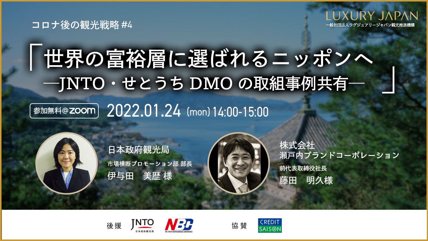 富裕層トラベルマーケット専門のB to Bプラットフォームを主催する一般社団法人ラグジュアリージャパン観光推進機構(代表理事:宮山直之)は、観光業に携わる自治体・DMO・事業関係者向けの無料ウェビナー「第4回富裕層観光戦略ウェビナー」を1月24日(月)14:00-15:00にzoomにて開催いたします。