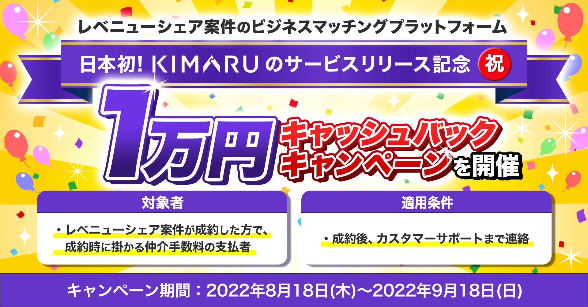 そこで今回は、KIMARUのサービスリリースを記念して、2022年8月18日(木)〜9月18日(日)の期間内に、レベニューシェア案件の成約をした方を対象*に「1万円のキャッシュバックキャンペーン」を開催することにいたしました。