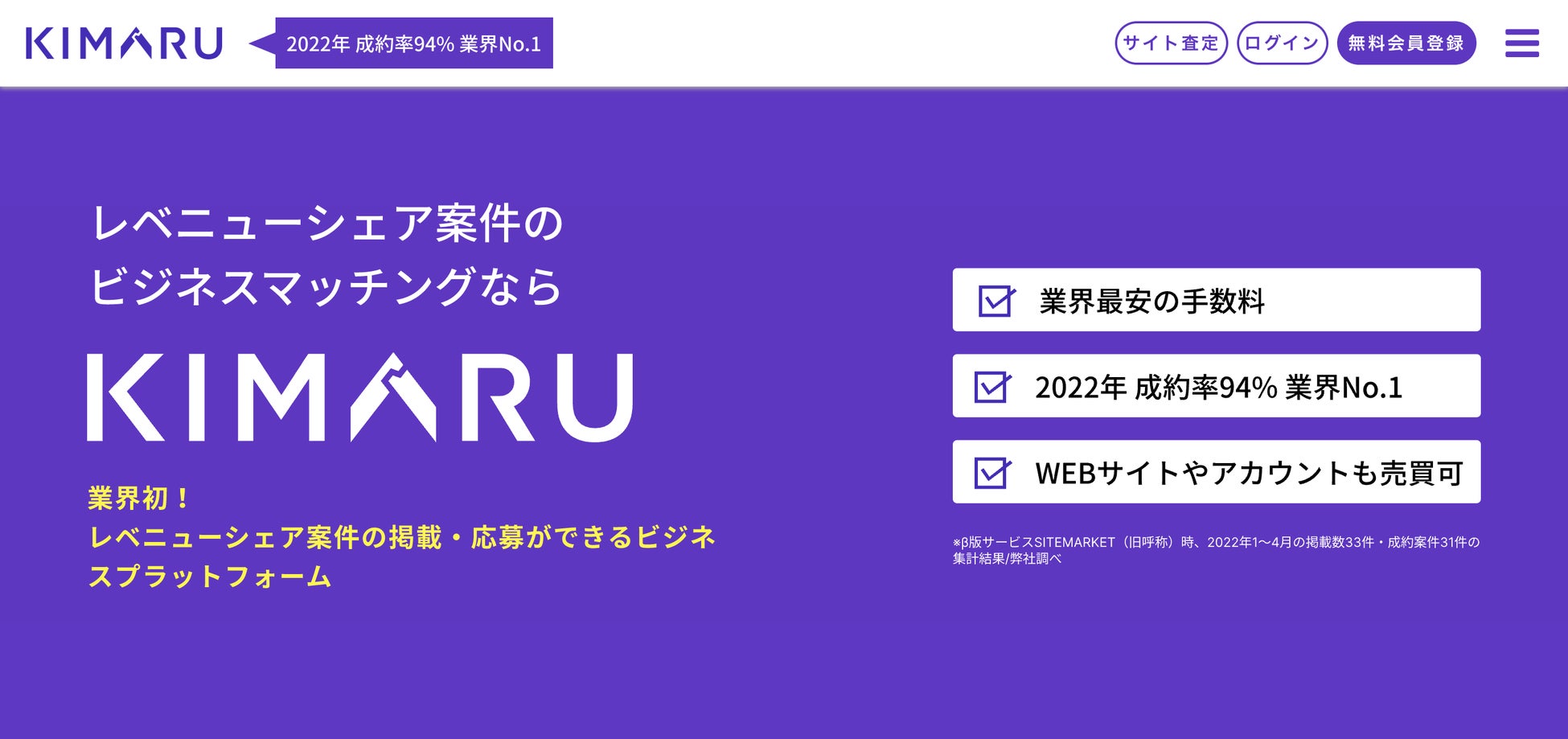 サイト売買・レベニューシェア案件などのビジネスマッチングを行うプラットフォームサービス「KIMARU」は、β版サービス”SITE MARKET”(旧)から改めて、2022年6月23日に本リリースされました。