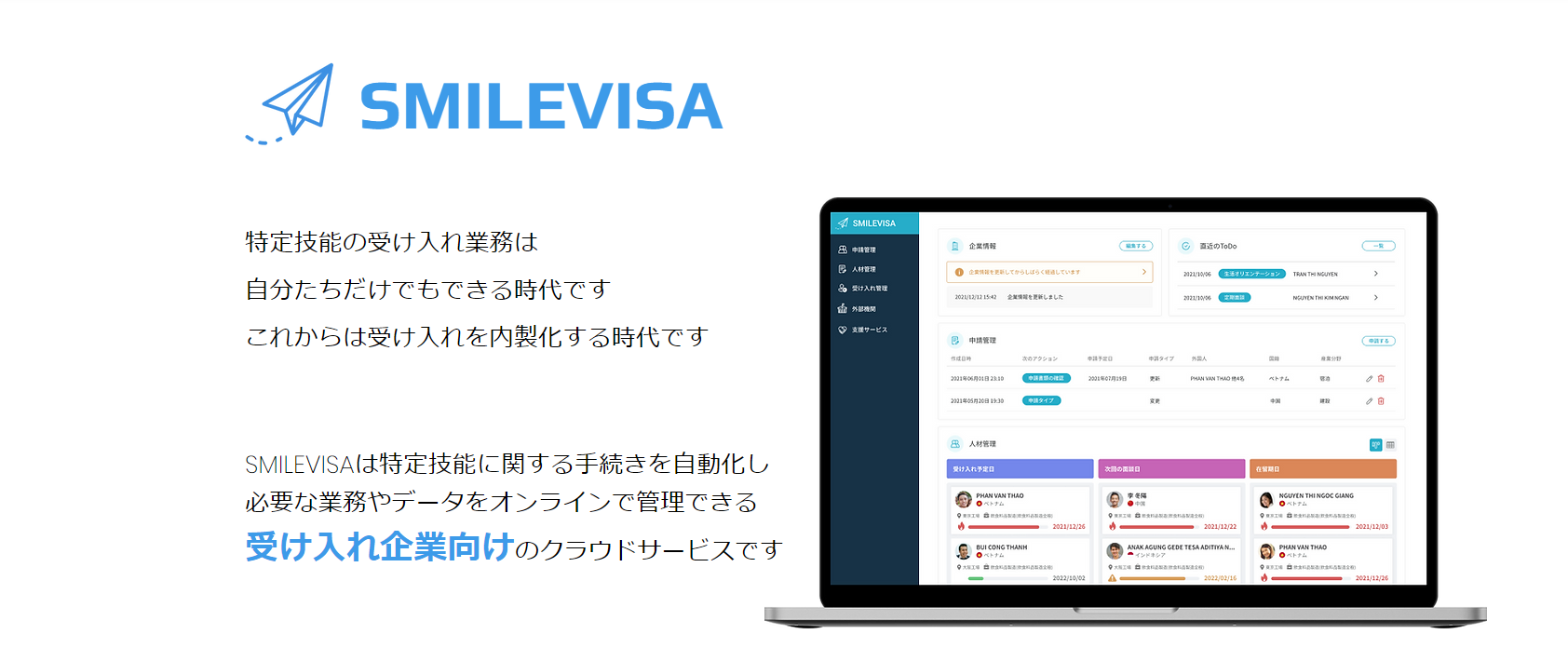 SMILEVISAは、特定技能の管理業務をより円滑に行うことを目的としたサービスであり、外国人の自社受入れを希望する企業をサポートします。