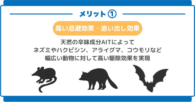 AITはニオイによる忌避効果・追い出し効果を狙うものではなく、粘膜への刺激によってネズミや小動物への効果を狙うものです。ニオイによる対策は動物の種類に合った成分のスプレーを個別に用意しなければなりませんが、AITはネズミだけではなくハクビシンやアライグマ、コウモリといった幅広い動物が対象となります。また、コバエのような害虫にもAITは有効です。