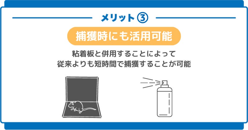 粘着板で捕獲を行う場合、粘着板単体で捕まえるのであれば動物が自然と板のほうに進んでいくのを待つしかありません。一方で「プロテクトアクリッド」も併用する場合は、粘着板の方向にスプレーを使って積極的に追い込むことによって短時間で捕まえることができます。