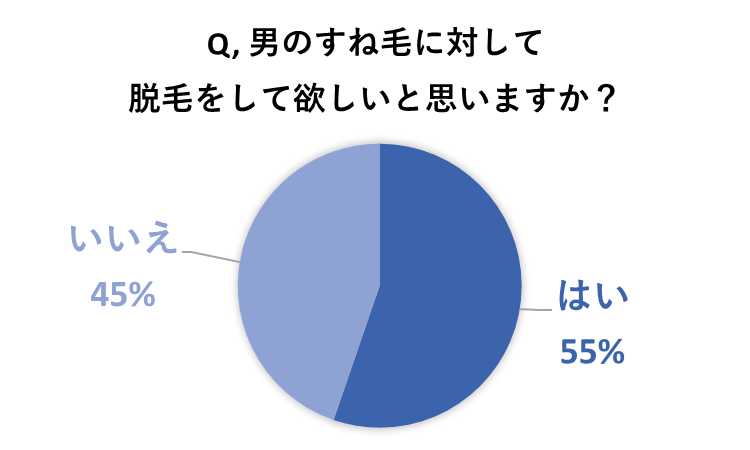 気になると回答した方を対象に、すね毛を脱毛して欲しいか否か質問したところ、「はい」と回答した方は55%、「いいえ」と回答した方は45%となりました。