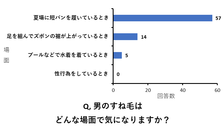 男のすね毛が気になると回答した方を対象に、「どんな場面で気になるか」調査した結果、「夏場に短パンを履いているとき」が57回答と最も多くの割合を占めていることが分かりました。