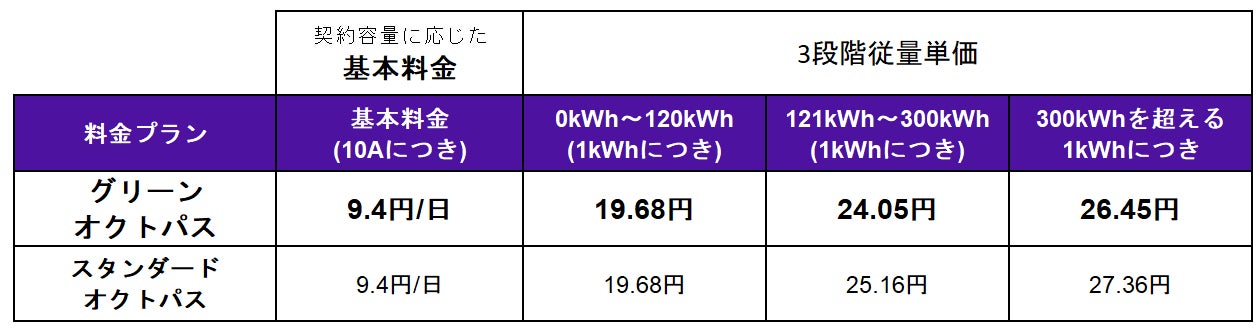 今回の新料金プランは、契約容量等に応じた基本料金と、使用量に応じて計算される3段階従量単価を採用した「グリーンオクトパス」と「スタンダードオクトパス」の2種類です。