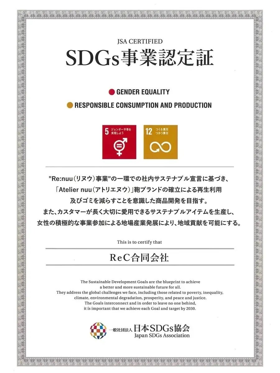 また、Atelier nuuのコレクションを企画・製造・販売するReC合同会社では、社内Re:nuu宣言に基づき持続可能な開発目標(SDGs)の5番(ジェンダー平等を実現しよう)、12番(つくる責任、つかう責任)を自社が目指す目標として最適であることをSDGs事業認定証により認められました。今後これらの目標の達成をかばん作りを通して支援してまいります。