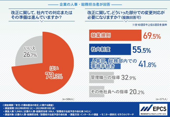 株式会社EPコンサルティングサービス(本社所在地:東京都港区、代表取締役:野﨑 正幸)は、企業の人事・総務担当者/配偶者が出産予定の会社員を対象に、「育児・介護休業法の改正」に関する調査を実施しました。